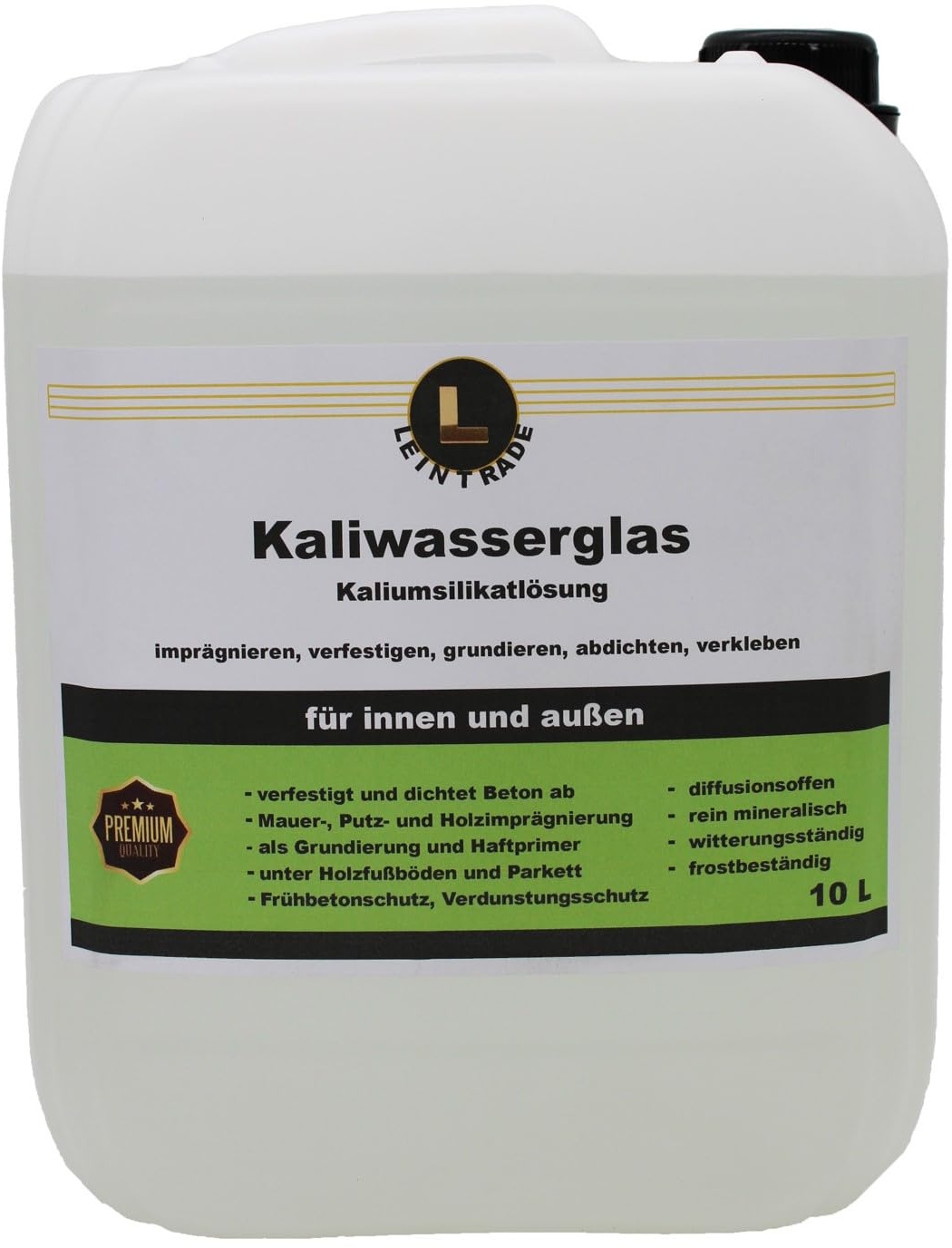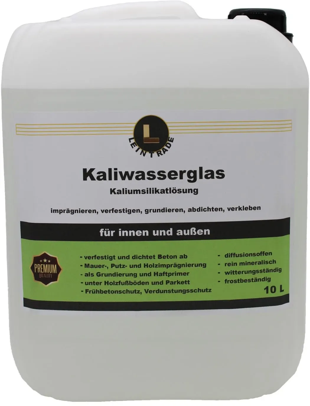 Kategorie: Reinigungsmittel - Leintrade - GTIN:4262434130012 - Das Kaliwasserglas vergütet und imprägniert Beton, Estrich, Putz und Mörtle, konserviert Holz und Mauerwerk. Das Kaliwasserglas egalisiert die Saugfähigkeit von Putzen ohne Filmbildung. Erhöht die Oberflächenhärte und Kratzfestigkeit. Erhöht die Beständigkeit gegen Frost und Nässe, geeignet für den Innen- und Außenbereich. Ist als Grundierung und als Bindemittel für Silikatfarben geeignet. Findet Verwendung zur Herstellung von Beschichtungs-, Abdichtungs- und Imprägnierungsmitteln. - 29,99 Euro bei Amazon Marketplace Home Improvement - gefunden von billiger.de Dieses 10-Liter-Angebot ist eine gute Wahl für Anwender, die eine unverdünnte und vielseitige Lösung suchen. ![]() ![]() LEVEL PLUS Kaliwasserglas 10 Liter Unverdünnt Haftgrund Bindemittel Holzimprägnierung Pur Wasserglas 100%, Versiegelung RM01