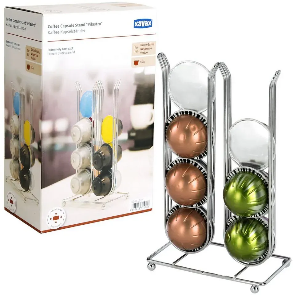 7 Händlerangebote bei billiger.de - Kategorie: Kaffeezubehör & Espressozubehör - xavax - elegantes Drahtgestell zur übersichtlichen Aufbewahrung und Sortierung der unterschiedlichen Kaffeekapsel-Sorten, hochwertig verchromt, dadurch langlebig und leicht zu reinigen, 4 Drahthalter für jeweils 4 Kapseln (insgesamt 16 Kapseln), der Kapselständer ist sehr platzsparend und ein Highlight in jeder Küche, geeignet für alle Dolce-Gusto-Kapseln sowie auch für Nespresso-Vertuo-Kapseln, Technische Eigenschaften: Installation: Stand, Material: Edelstahl, Max. Kapselanzahl: 16, Breite: 15 cm, Höhe: 23,8 cm, Tiefe: 8,6 cm, Farbe: Silber, Farbton: Verchromt, Produktbereich: Küche & Haushalt, Passend für: Dolce Gusto Kapseln, Nespresso Vertuo Kapseln, Lieferumfang: 1 Kaffee-Kapselständer 'Pilastro', - GTIN:4047443344830 ![]() ![]()