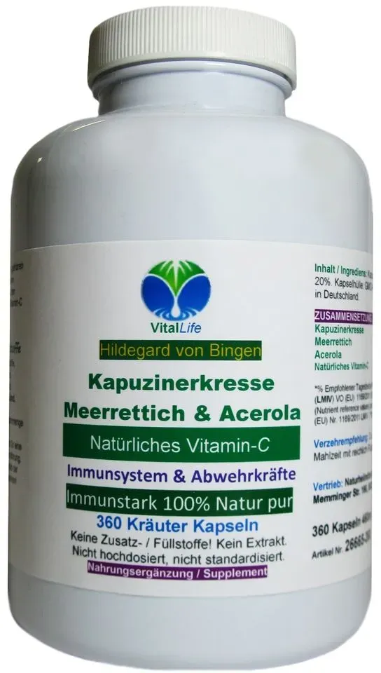 236,25 /kg - Kategorie: Nahrungsergänzungsmittel - VitalLife - GTIN:4031491266664 - Kapuzinerkresse + Meerrettich + AcerolaImmunsystem Abwehrkräfte Superfood nach Hildegard von Bingen 180 Pulver Kapseln a 460mg Immunstarke Vitalstoffe können erheblich zum Erhalt von Gesundheit und Wohlbefinden beitragen. Bereits Hildegard von Bingen erkannte die Vorzüge von Kapuzinerkresse und Meerrettich für Immunsystem und Abwehrkräfte. In Verbindung mit natürlichem Vitamin-C und Antioxidantien des Superfoods Acerola gelingt die tägliche Pflege sämtlicher Immunfaktoren auf natürlicher Basis OHNE Zusatzstoffe. Inhaltsstoffe / Zutaten:KAPUZINERKRESSE + MEERRETTICH + ACEROLA natürliches VITAMIN-C nach Hildegard von Bingen. Kapselhülle aus Gelatine (Rind)* Warum wir Gelatine verwenden können Sie in der Beschreibung unter der Verzehrempfehlung nachlesen. Sie erhalten Nahrungsergänzung ohne irgendwelche Zusatzstoffe oder Füllstoffe - NATUR PUR Verzehrempfehlung: 3 x 2 Kapseln über den Tag verteilt vor einer Mahlzeit mit reichlich Flüssigkeit (1 Glas Wasser) einnehmen. Vegetarische / Vegane Kapseln? Da sich pflanzliche Zellulose oft erst im unteren Verdauungstrakt auflöst, was bei den meisten Stoffen ungewünscht ist, haben wir uns bislang nicht zu einer pauschalen Umstellung auf vegane Kapselhüllen aus Hemicellulose entschieden. Unsere Kapseln sind aus Rindergelatine. Abgefüllt in Deutschland. Weitere Hinweise: Nahrungsergänzungsmittel sind kein Ersatz für eine ausgewogene und ... Dieses Produkt von Kräuterhaus Sanct Bernhard bietet eine gute Menge an Kapseln mit Senfölen und natürlichem Vitamin C. ![]() ![]() Kräuterhaus Sanct Bernhard Sanct Bernhard Kapuzinerkresse-Meerrettich-Kapseln mit Senfölen & natürlichem Vitamin C aus der Acerolakirsche | 180 Stück