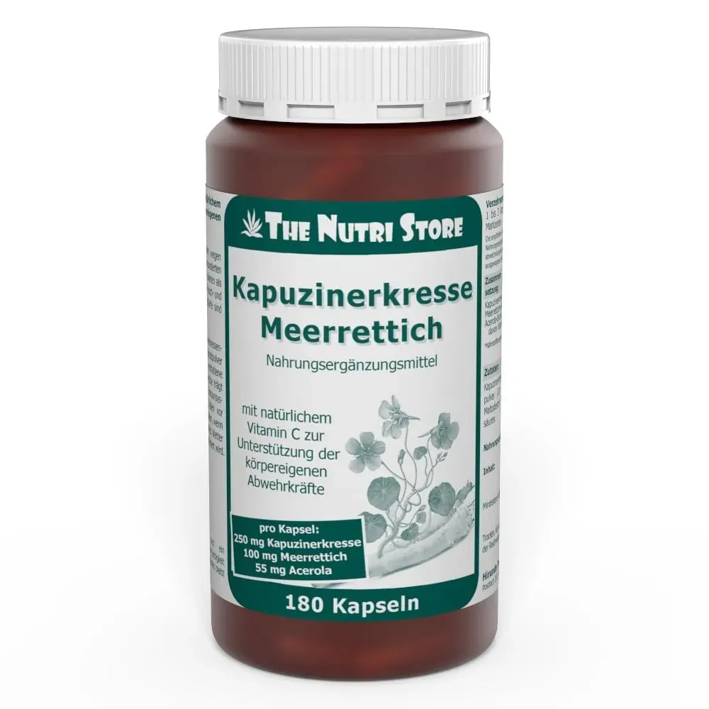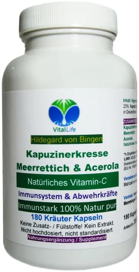 Kategorie: Nahrungsergänzungsmittel - Kräuterhaus Sanct Bernhard - GTIN:4250382211242 - Mit Kapuzinerkressekrautpulver und Meerrettichwurzelpulver Mit natürlichem Vitamin C aus der Acerolakirsche Vitamin C trägt zum Erhalt einer normalen Funktion des Immunsystems bei Inhalt 180 Kapseln - 20,90 Euro bei Amazon Marketplace Health & Personal Care - gefunden von billiger.de Dieses Produkt bietet eine größere Menge an Kapseln mit natürlichem Vitamin C zu einem mittleren Preis. ![]() ![]() The Nutri Store Kapuzinerkresse Meerrettich Kapseln 180 Stk. mit natürlichem Vitamin C