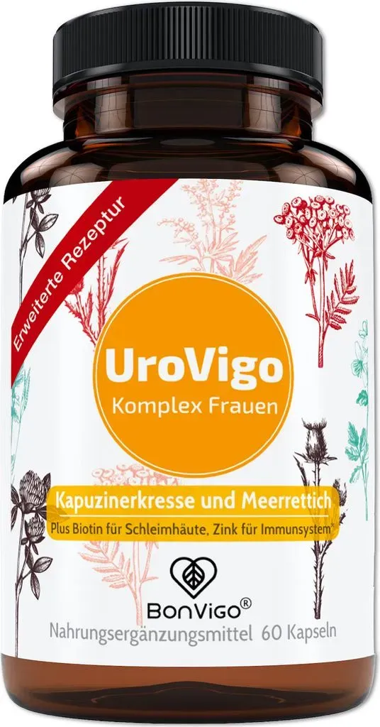 649,75 /kg - Kategorie: Nahrungsergänzungsmittel - BonVigo - GTIN:4260524061970 - KAPSELN FüR FRAUEN. UroVigo führt zwei Welten zusammen. Orthomolekulare Wirkstoffe mit wissenschaftlicher Expertise in einen reichhaltigen 8-Pflanzen-Komplex nach Erkenntnissen der Naturkunde ein. Die Mikronährstoffe sind gründlich erforscht, ihre Wirkung ist von EU-Behörden bestätigtUROVIGO üBERZEUGT mit einer breiten naturkundlichen Auswahl von Pflanzen, besonders wichtig ist uns das Senföl der Kapuzinerkresse. Die weit bekannte Kombi aus Kapuzinerkresse und Meerrettich erweitern wir um Kürbiskern, Cranberry, Liebstöckel, Löwenzahn, Minze, Brennessel. Die Rezeptur verfolgt damit ein grundlegend anderes Konzept als vielfach ne Mittel mit D-Mannose-ZuckerZWEIFACH. Gleich zwei Wirkstoffe unterstützen Haut und Schleimhaut. Wissenschaftlich erforscht: Die orthomolekularen Mikronährstoffe *Vitamin A und Biotin tragen nachweislich zum Erhalt normaler Haut und normaler Schleimhäute bei, also auch der Schleimhaut von Blase und HarnröhreIMMUNSYSTEM, ZELLSCHUTZ. Wichtig für Frauen, die ihre Abwehrkraft fördern wollen: *Vitamin A und Zink tragen zur normalen Funktion des Immunsystems bei, Zink trägt zudem dazu bei, die Zellen vor oxidativem Stress zu schützen. Zur weiteren Unterstützung empfehlen wir BonVigo ImmunVigo, CandiVigo, Flora XL Darmbakterien und Ballaststoffe oder Bienenkraft KapselnL-METHIONIN, in den veganen Kapseln zusätzlich enthalten, ist eine lebenswichtige Aminosäure, die der Körper ... Dieses Produkt bietet eine größere Menge an Kapseln nach Hildegard von Bingen und ist frei von Zusatzstoffen. ![]() ![]() VitalLife Immunstark 360 Pulver Kapseln nach Hildegard von Bingen - Kapuzinerkresse + Meerrettich + Acerola Vitamin C. NATUR pur OHNE Zusatzstoffe.