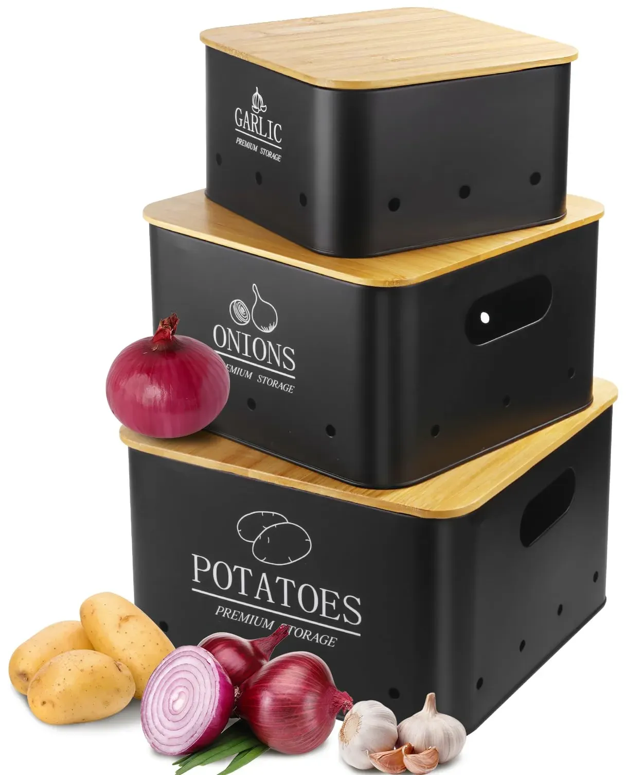 Auf Lager Versand durch AmazonAvmvnvc Kartoffel Aufbewahrungsbox - 3er Set Kartoffel Zwiebel Knoblauch Aufbewahrung - Zwiebeltopf Kartoffelbox Knoblauchtopf - Hält Gemüse Länger Frisch (Schwarz, Rechteckig)