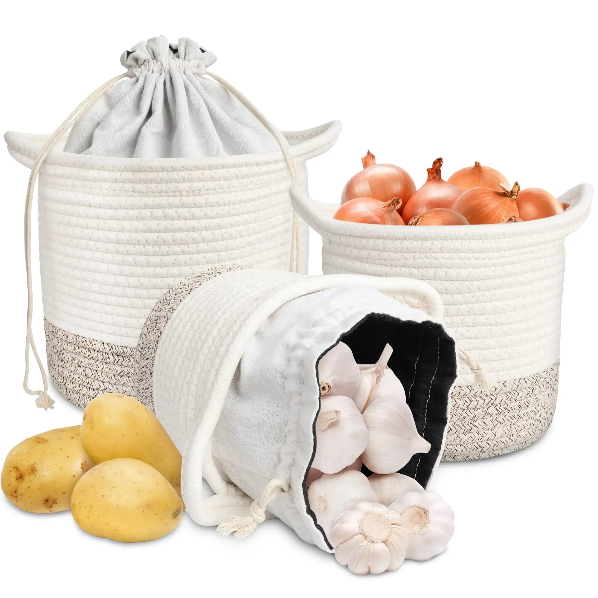 Auf Lager Versand durch AmazonMarsred 3er Nachhaltige Kartoffeltopf aus Jute Baumwollseil, Kartoffel Aufbewahrungsbox mit Griff, hält Gemüse länger frisch Zwiebel Knoblauch Aufbewahrung