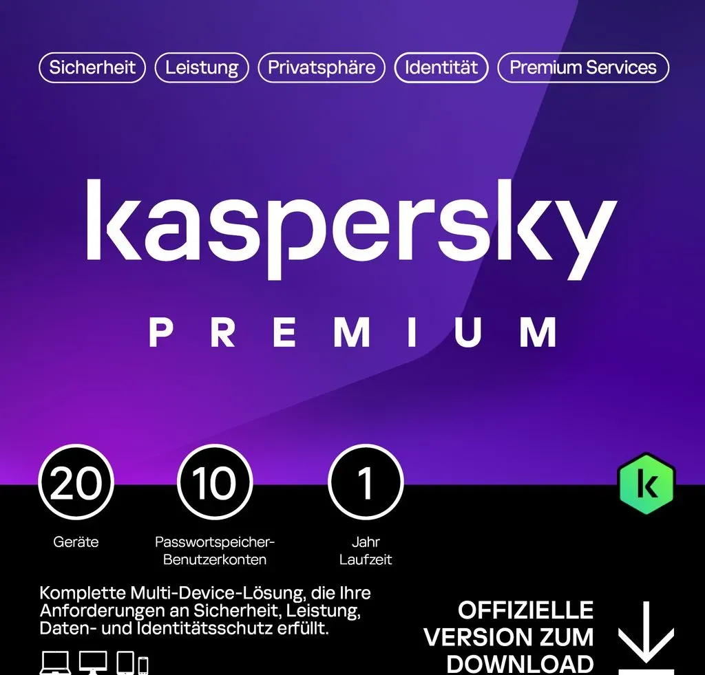 keine Angabe Jetzt als Download verfügbar.Kaspersky Premium Total Security 2025 | 20 Geräte | 1 Jahr | Anti-Phishing und Firewall | Unbegrenzter VPN | Passwort-Manager | Kindersicherung | 24/7 Unterstützung | PC/Mac/Mobile | Code per Email