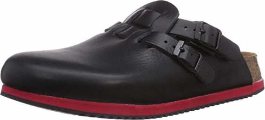 Zustand: Neu - Clogs Clogs für Damen - Birkenstock - 582634-40 - EAN: 4052001429027 - anatomisch geformtes Kork-Latex-Fußbett mit zusätzlicher Weichbettung Superlaufsohle mit trittdämpfender Zwischensohle aus leichtem, flexiblem EVA-Kunststoff rutschhemmende öl- und fettbeständige Gummilaufsohle Rutschhemmung getestet nach EN ISO 20347:2012 (Kategorie SRA) bei Bedarf nach hinten umklappbarer Riemen für zusätzlichen stablien Halt an der Ferse individuell verstellbare Dornschließe aus Metall Naturleder ist an der unbehandelten Oberfläche zu erkennen die hautfreundliche, flexible Leder-Decksohle schmiegt sich sanft an den Fuß und passt sich an dessen Kontur an offenporige und dadurch besonders atmungsaktive Oberfläche ermöglicht auch bei starker körperlicher Aktivität ein angenehmes Fußklima besonders tiefe Ausformung im Fersenbereich stützt das Fußgewebe und hält das Fersenbein stabil in seiner natürlichen Position - für einen nahezu ähnlich starken Halt wie in einem geschlossenen Schuh - Verkäufer: Dönges im amazon.de Marketplace ![]() kaufland.d e Birkenstock Superlauf Kay SL Damen-Clog, schwarz/rot EN ISO 20347:2012 SRC, schmale Fußweite schwarz Größe 35