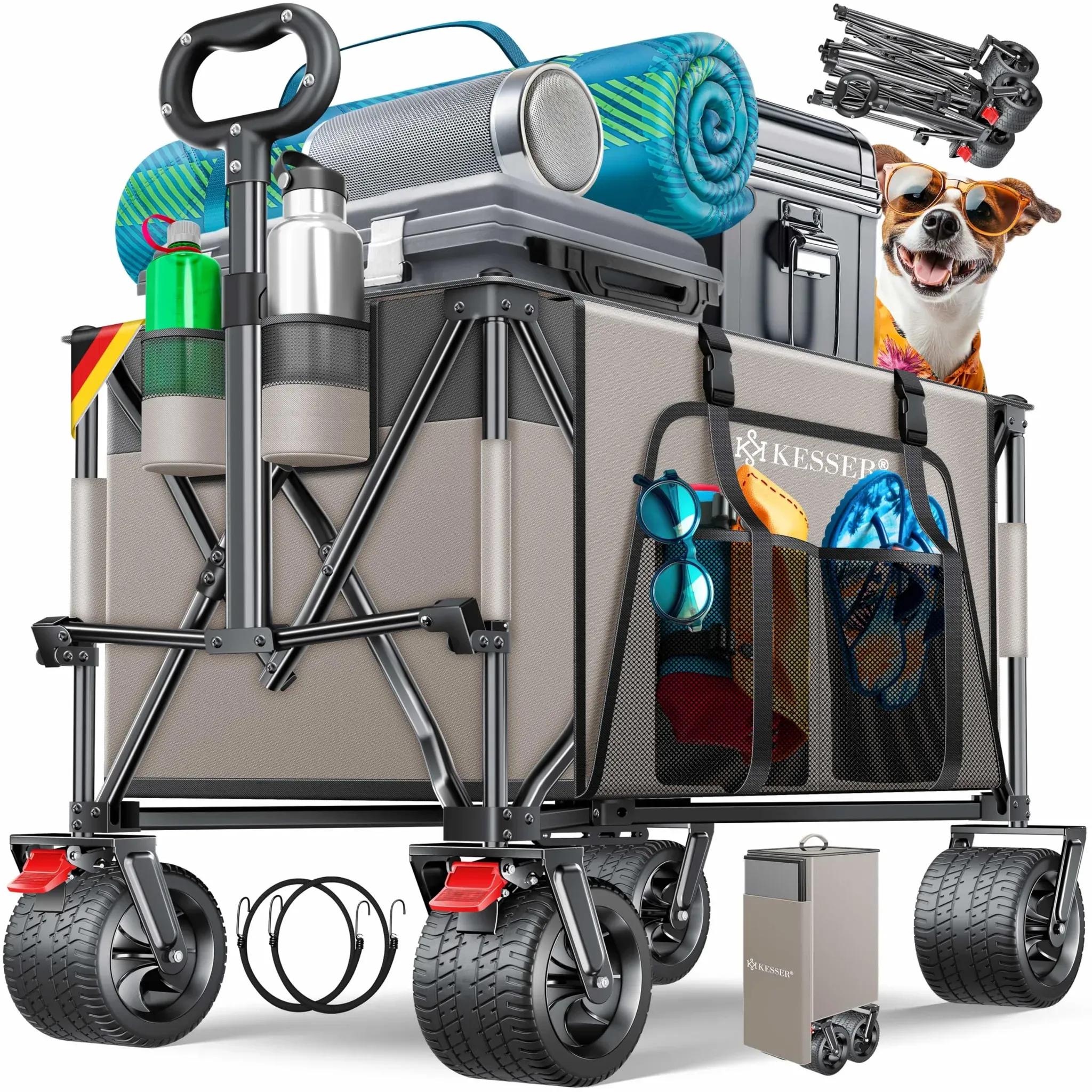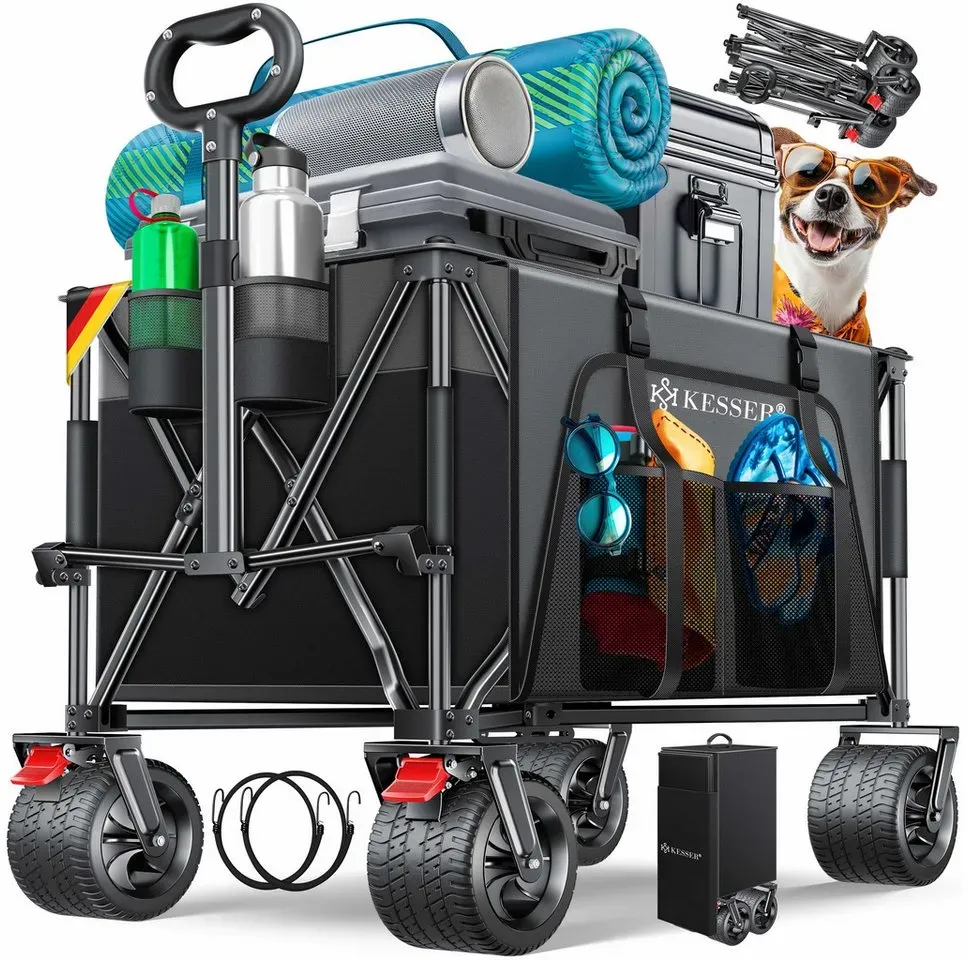 lieferbar-in 2-3 Werktagen bei dirKESSER Bollerwagen GTR9000 Handwagen Outdoor Transportwagen 200L Stauraum 360 Räder (Strandwagen faltbar inklusive Cover, Seitentasche & Getränkehalter), Gartenwagen UV- & Wetterbeständig mit Feststell-Bremsen & breite Räder schwarz