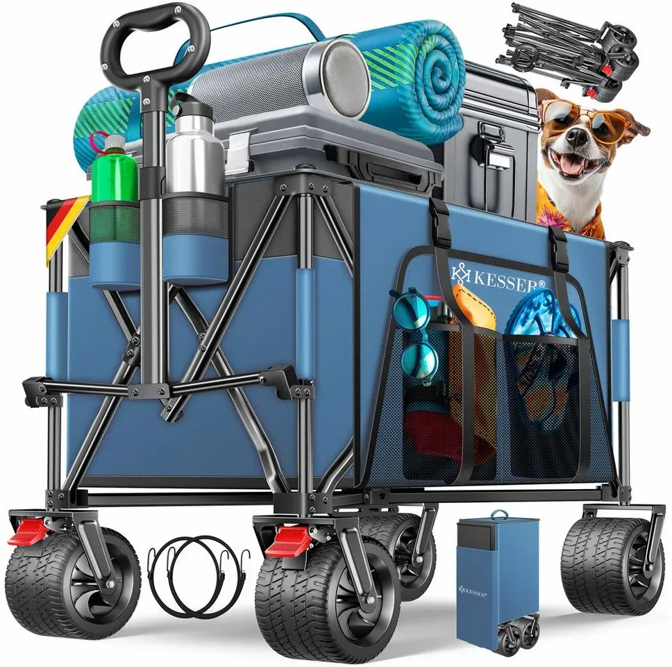 lieferbar-in 2-3 Werktagen bei dirKESSER Bollerwagen GTR9000 Handwagen Outdoor Transportwagen 200L Stauraum 360 Räder (Strandwagen faltbar inklusive Cover, Seitentasche & Getränkehalter), Gartenwagen UV- & Wetterbeständig mit Feststell-Bremsen & breite Räder blau