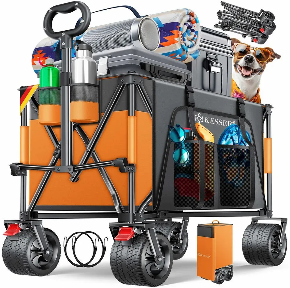 lieferbar-in 2-3 Werktagen bei dirKESSER Bollerwagen GTR9000 Handwagen Outdoor Transportwagen 200L Stauraum 360 Räder (Strandwagen faltbar inklusive Cover, Seitentasche & Getränkehalter), Gartenwagen UV- & Wetterbeständig mit Feststell-Bremsen & breite Räder orange