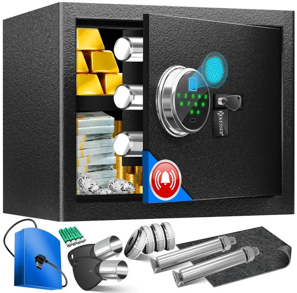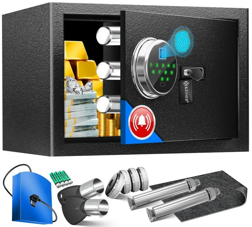 Kategorie: Tresore - Kesser - GTIN:4255598358668 - MAXIMALE SICHERHEIT: Der KESSER Fingerprint Tresor bietet höchste Sicherheit durch biometrische Fingerabdrucktechnologie, die bis zu 99 Fingerabdrücke speichert. Mit einer Berührung können Sie den robusten Tresor öffnen. Diese Funktion stellt sicher, dass nur autorisierte Personen Zugang zu Ihren Wertsachen haben, und bietet Ihnen damit ein Höchstmaß an Schutz vor unbefugtem Zugriff und Diebstahl. FLEXIBLE öFFNUNGSMöGLICHKEITEN: Dank des modernen LED-Displays können Sie den Tresor auf verschiedene Weisen öffnen - per Code, Fingerabdruck oder Schlüssel. Diese Vielseitigkeit bietet Ihnen zusätzliche Sicherheit und Flexibilität, sodass Sie jederzeit und unter allen Umständen Zugang zu Ihren Wertsachen haben, egal ob bei Stromausfall oder technischen Problemen. ROBUSTHEIT UND ZUVERLäSSIGKEIT: Der KESSER Fingerprint Tresor ist aus hochwertigen Materialien gefertigt und bietet maximale Robustheit und Verlässlichkeit. Wasserschutz und Feuerschutz gewährleisten, dass Ihre Wertsachen nicht nur vor Diebstahl, sondern auch vor Elementarschäden sicher sind, was Ihnen ein beruhigendes Gefühl der Sicherheit gibt. UMFANGREICHES ZUBEHöR: Im Lieferumfang sind Ersatzschlüssel, Batterien, eine Schutzmatte, ein Notfallakku, Fußpads und Wandbolzen enthalten. Diese zusätzlichen Komponenten sorgen dafür, dass der Tresor sicher installiert und genutzt werden kann, und bieten Ihnen alle notwendigen Werkzeuge, um Ihre Wertsachen optimal zu schützen ... Dieses OTTO-Angebot ist ein gutes Beispiel für einen mittelgroßen Tresor, der sich gut in Möbel integrieren lässt. ![]() ![]()