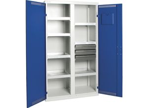 Hängeschränke Wohnen Aufbewahren Ordnen Schränke, Kommoden Vitrinen - - Umweltschrank mit Türlochung, HxBxT 1800 x 1000 x 500 mm, 7 Wannenböden, lichtgrau / enzianblau. Anlieferung = montiert. Höhe = 1800 mm. Breite = 1000 mm. Tiefe = 500 mm. Material = Stahlblech. Korpusfarbe = lichtgrau RAL 7035. Türfarbe = enzianblau RAL 5010. Türart = Flügeltür. Verschlussart = Drehgriff-Zylinderschloss. Oberfläche = pulverbeschichtet. Anzahl Wannenböden = 7 Stück. Volumen Wannenböden = 22 Liter. Wannenbodentraglast = 100 kg. Höhenverstellraster Wannenböden = 33 mm. Zolltarifnummer = 94032080. Herkunftsland = DEU. Bruttogewicht = 116.7 kg. Gewicht = 110 kg. Mit Mitteltrennwand für noch mehr Ordnung und übersicht . Zur vorschriftsmäßigen Lagerung gewässergefährdender Medien in Kleingebinden. TüV-Baumuster geprüft - Schränke nicht brennbar nach DIN EN 13501-1. Dicht geschweißte, entnehmbare Wannenböden mit hohem Auffangvolumen. Mit Dokumententaschen. Mit gelochten Schranktüren zur natürlichen Entlüftung. Der Umweltschrank mit Türlochung bietet eine vorschriftsmäßige Lagerung gewässergefährdender Medien in Kleingebinden. Er ist TüV-Baumuster geprüft und nicht brennbar nach DIN EN 13501-1. Durch seine robuste Konstruktion aus verschweißtem Qualitätsstahlblech und einer widerstandsfähigen Struktur-Pulverbeschichtung überzeugt dieser Schrank. Die verzinkten, dichtgeschweißten Wannenböden sind entnehmbar und im 33-mm-Raster höhenverstellbar, was eine flexible Anpassung an unterschiedliche ... Diese RAU Werkbank bietet eine stabile Arbeitsfläche und praktische Schubladen für die Organisation von Werkzeugen. ![]() RAU Werkbank, Gestellbauweise, 4 Schubladen Größe L, Tiefe 700 mm, Breite 1000 mm