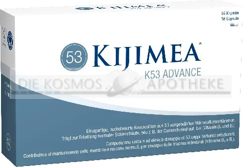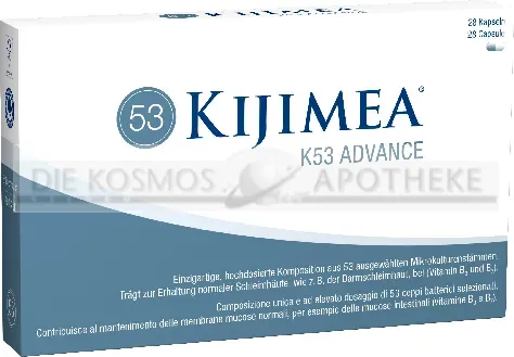 0.89 / 1 ct - Kategorie: Nahrungsergänzungsmittel - Synformulas GmbH - GTIN:4260344391417 - PZN:18379773 - Das Darmmikrobiom ist ein komplexes und vielfältiges ökosystem. Darunter versteht man die Gemeinschaft der im Darm lebenden Mikroorganismen. Ganz entscheidend sind dabei eine hohe Vielfalt und Vielzahl der im Darm angesiedelten Bakterienstämme. Kijimea K53 Advance enthält eine einzigartige Komposition aus 53 aufeinander abgestimmten Bakterienstämmen, die den Darm besiedeln können. Um ihnen einen optimalen Nährboden zu bieten, enthält Kijimea K53 Advance zusätzlich Vitamin B3 und B7, die zur Erhaltung normaler Schleimhäute beitragen. Verzehrempfehlung: Für Erwachsene und Kinder ab n: 1 x täglich 1 Kapsel unzerkaut mit ausreichend Flüssigkeit zu einer Mahlzeit (morgens, mittags oder abends) verzehren. Da bei kleineren Kindern Erstickungsgefahr durch Verschlucken besteht, sollte die Kapsel geöffnet und der Inhalt mit etwas Flüssigkeit verzehrt werden. Nebenwirkungen: Es sind keine Nebenwirkungen beim Verzehr von Kijimea K53 Advance bekannt. Verträglichkeit: Kijimea K53 Advance ist gluten-, fruktose- und laktosefrei, frei von Konservierungs- und Aromastoffen sowie Süßungsmitteln. Das Produkt sollte nicht verzehrt werden, wenn Sie allergisch gegen einen der Inhaltsstoffe sind. Lagerungsempfehlung: Kijimea K53 Advance sollte trocken und unter 25 C aufbewahrt werden. Außerhalb der Reichweite von kleinen Kindern lagern. Weitere Informationen: Kijimea K53 Advance enthält 53 ... Dieses Angebot von Shop Apotheke DE ist eine gute Option für 56 Kapseln. ![]() ![]() Synformulas GmbH Kijimea K53 Advance Kapseln 56 St