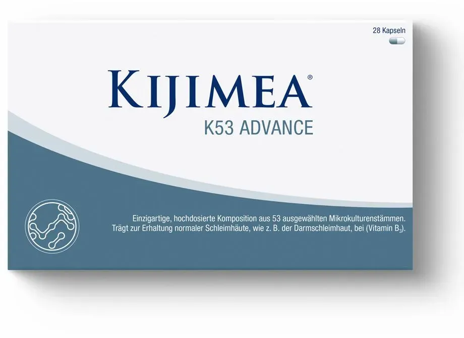 0.98 / 1 ct - Kategorie: Nahrungsergänzungsmittel - Synformulas GmbH - GTIN:4260344391400 - PZN:18379767 - Das Darmmikrobiom ist ein komplexes und vielfältiges ökosystem. Darunter versteht man die Gemeinschaft der im Darm lebenden Mikroorganismen. Ganz entscheidend sind dabei eine hohe Vielfalt und Vielzahl der im Darm angesiedelten Bakterienstämme. Kijimea K53 Advance enthält eine einzigartige Komposition aus 53 aufeinander abgestimmten Bakterienstämmen, die den Darm besiedeln können. Um ihnen einen optimalen Nährboden zu bieten, enthält Kijimea K53 Advance zusätzlich Vitamin B3 und B7, die zur Erhaltung normaler Schleimhäute beitragen. Verzehrempfehlung: Für Erwachsene und Kinder ab n: 1 x täglich 1 Kapsel unzerkaut mit ausreichend Flüssigkeit zu einer Mahlzeit (morgens, mittags oder abends) verzehren. Da bei kleineren Kindern Erstickungsgefahr durch Verschlucken besteht, sollte die Kapsel geöffnet und der Inhalt mit etwas Flüssigkeit verzehrt werden. Nebenwirkungen: Es sind keine Nebenwirkungen beim Verzehr von Kijimea K53 Advance bekannt. Verträglichkeit: Kijimea K53 Advance ist gluten-, fruktose- und laktosefrei, frei von Konservierungs- und Aromastoffen sowie Süßungsmitteln. Das Produkt sollte nicht verzehrt werden, wenn Sie allergisch gegen einen der Inhaltsstoffe sind. Lagerungsempfehlung: Kijimea K53 Advance sollte trocken und unter 25 C aufbewahrt werden. Außerhalb der Reichweite von kleinen Kindern lagern. Weitere Informationen: Kijimea K53 Advance enthält 53 ... Dieses Angebot von Shop Apotheke DE ist eine beliebte Wahl für 28 Kapseln. ![]() ![]() Synformulas GmbH Kijimea K53 Advance Kapseln 28 St