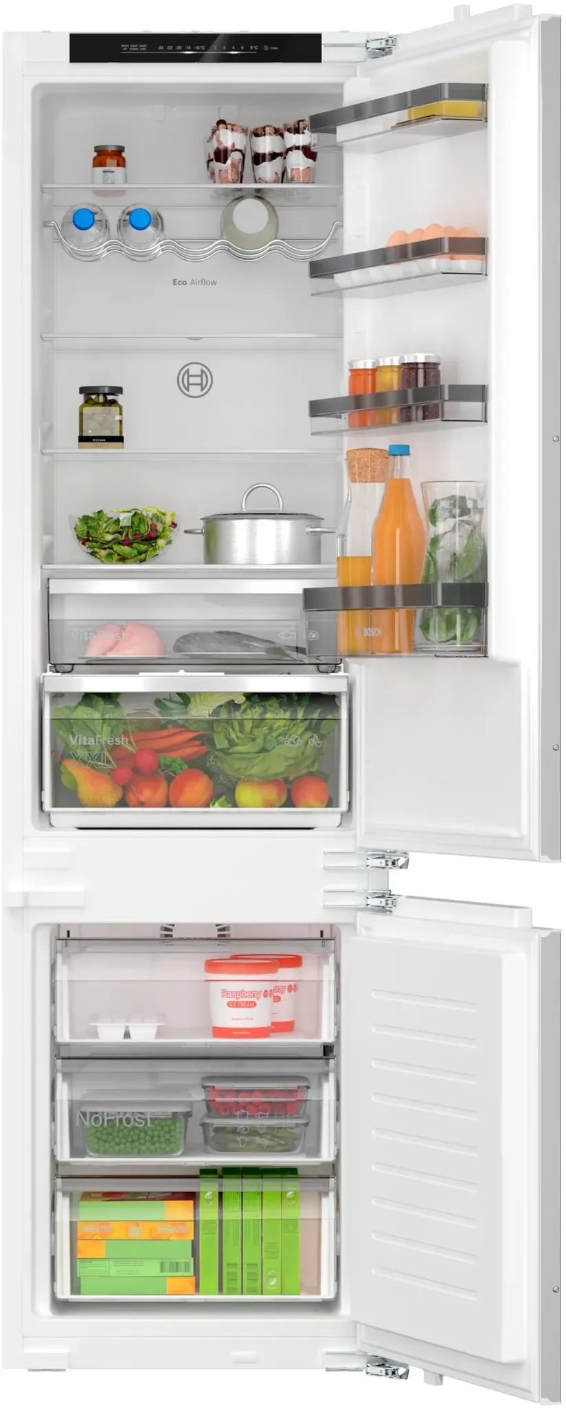 Bosch - EAN: 4242005359493 - LED-Innenbeleuchtung, Nutzinhalt Kühlen/Gefrieren: 215 l / 75 l, Energieeffizienzklasse: D, 184 kWh/Jahr, NoFrost-Frostreduzierung, 4 / 4 Abstellflächen, 3 Gefrierschubladen, Flaschenablage, Schnellkühl- und Schnellgefrier-Funktion, Digitales Display, elektronische Bedienung, VitaFresh XXL 0 C-System - bei expert.de - aus Yadore Produktdaten ![]() ![]() Bosch KIN96VFD0, Serie 4, Einbau-Kühl-Gefrier-Kombination mit Gefrierbereich unten, 193.5 x 55.8 cm, Flachscharnier