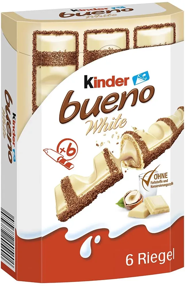 Quellen: Hersteller? und Händlerangaben zu Produktbeschreibung, Zutaten, Varianten, Packungsgrößen und Nährwerten[1][2][3][4][5][7][9]. Jetzt live Suche nach kinder bueno starten! Empfohlene Kinder bueno Angebote*Durch Käufe über Links zu Händlern kann diese Website eine Provision erhalten, u.a. durch das eBay Partner Network und das AmazonPartnerNetEin kleineres Pack mit 6 Kinder Bueno Riegeln, gut zum Probieren oder für den kleinen Hunger zwischendurch. ![]() ![]() Ferrero kinder bueno Schokoriegel 6 St.