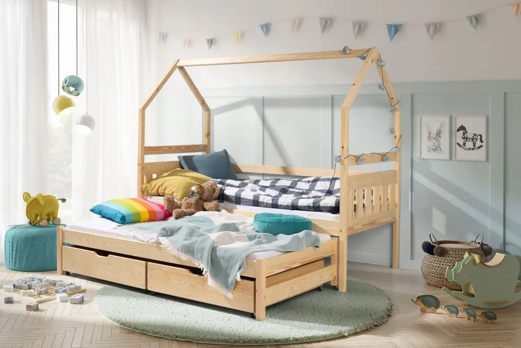 Kategorie: Kinderzimmermöbel - crazy pine - GTIN:5905771005177 - Kinderbett mit Rausfallschutz Das Crazy House Hausbett verfügt über 31,5 cm hohe Barrieren, die das Kind vor dem Herausfallen schützen und ein sicheres Schlafumfeld bieten. Die Barrieren erstrecken sich über 2/3 der Bettlänge, sodass sie optimalen Schutz bieten, während der mittige Eingang einen einfachen Zugang ermöglicht. Perfekt für Kleinkinder und Kinder im Wachstum. Montessori Bett in Weiß - Gefertigt aus massivem, schadstofffreiem Kiefernholz mit PEFC-Zertifizierung, kombiniert das Bett eine langlebige Konstruktion mit einer kindersicheren, glatten Oberfläche und abgerundeten Kanten. Die umweltfreundliche, wasserbasierte Lackierung sorgt für zusätzliche Sicherheit und einen gesunden Schlafplatz. Schubladen für zusätzlichen Stauraum - Das Bett verfügt über zwei geräumige Schubladen mit den Maßen 80x90x19 cm, die ideal für die Aufbewahrung von Spielzeug, Kleidung oder Bettwäsche sind. Die Schubladen bieten eine praktische Lösung, um das Kinderzimmer stets ordentlich zu halten. Lattenrost inklusive - Das Bett wird mit stabilen Holzlatten geliefert, die als Lattenrost dienen. Bitte beachten Sie, dass die Matratze nicht im Lieferumfang enthalten ist. Die maximale Belastung beträgt 120 kg und gewährleistet Stabilität auch für Eltern, die Zeit mit ihrem Kind verbringen möchten. Skandinavisches Design - Das schlichte, moderne Design in Form eines Hauses macht das Crazy House Kinderbetten zu einem Highlight in ... Das VitaliSpa Hausbett in Naturholz bietet eine warme Optik und zwei Schubladen für zusätzlichen Stauraum. ![]() ![]() VitaliSpa Hausbett, Natur, Holz, 2 Schubladen, Rechteckig, 80x160 cm, Kinder- & Jugendzimmer, Kindermöbel, Kinderbetten, Kindereinzelbetten