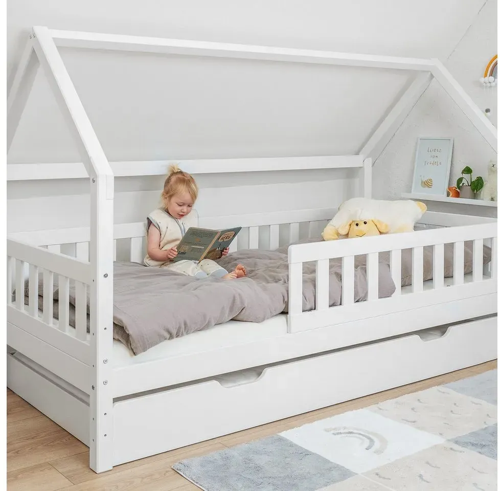 Kategorie: Kinderzimmermöbel - VitaliSpa - GTIN:4066731276400 - Ein optimales Design: Mit 'Franka' können Eltern ihren Kleinen ein stilvolles Holzbett für das Kinderzimmer bieten, das in jeder Wohnung eine gute Entscheidung ist. Durch das Bettenhaus-Design können sie das Bett, mit Dekoration oder Vorhängen, individuell anpassen. MAßE: Das Kinderbett ist passend für eine Matratze von 80x160 cm und hat eine Höhe von 155 cm. Alle detaillierten Größen sind auf den Fotos angegeben. Material: Das Hausbett besteht aus pflegeleichtem bambus. Lieferumfang: Hausbett, Montageanleitung, Montagematerial, 2 x Schubladen, Matratze. - 199,90 Euro bei XXXLutz.de - gefunden von billiger.de Das Bellabino Bia Kinderbett überzeugt mit Massivholz Kiefer, Rausfallschutz und zwei Schubladen im Montessori-Stil. ![]() ![]() Bellabino Bia Kinderbett 80x160 cm Hausbett mit Rausfallschutz, Lattenrost & 2 Schubladen Montessori Kinder Bett aus Massivholz Kiefer Bett für Jungen und Mädchen mit Stauraum in Weiß