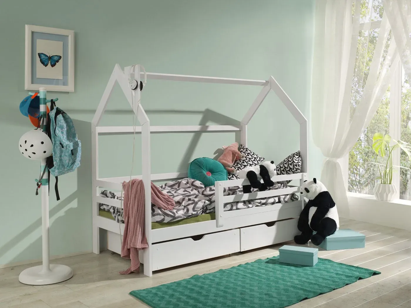 lieferbar-in 9-11 Werktagen bei dirthematys Kinderbett Hausbett Jugendbett mit 2 Schubladen mit abnehmbaren Rausfallschutz (MADE IN EU - für Jungen und Mädchen, in weiß oder Naur, in den Größen 80x160, 80x180 und 90x200cm erhältlich), aus massiv Kieferholz weiß 80 cm