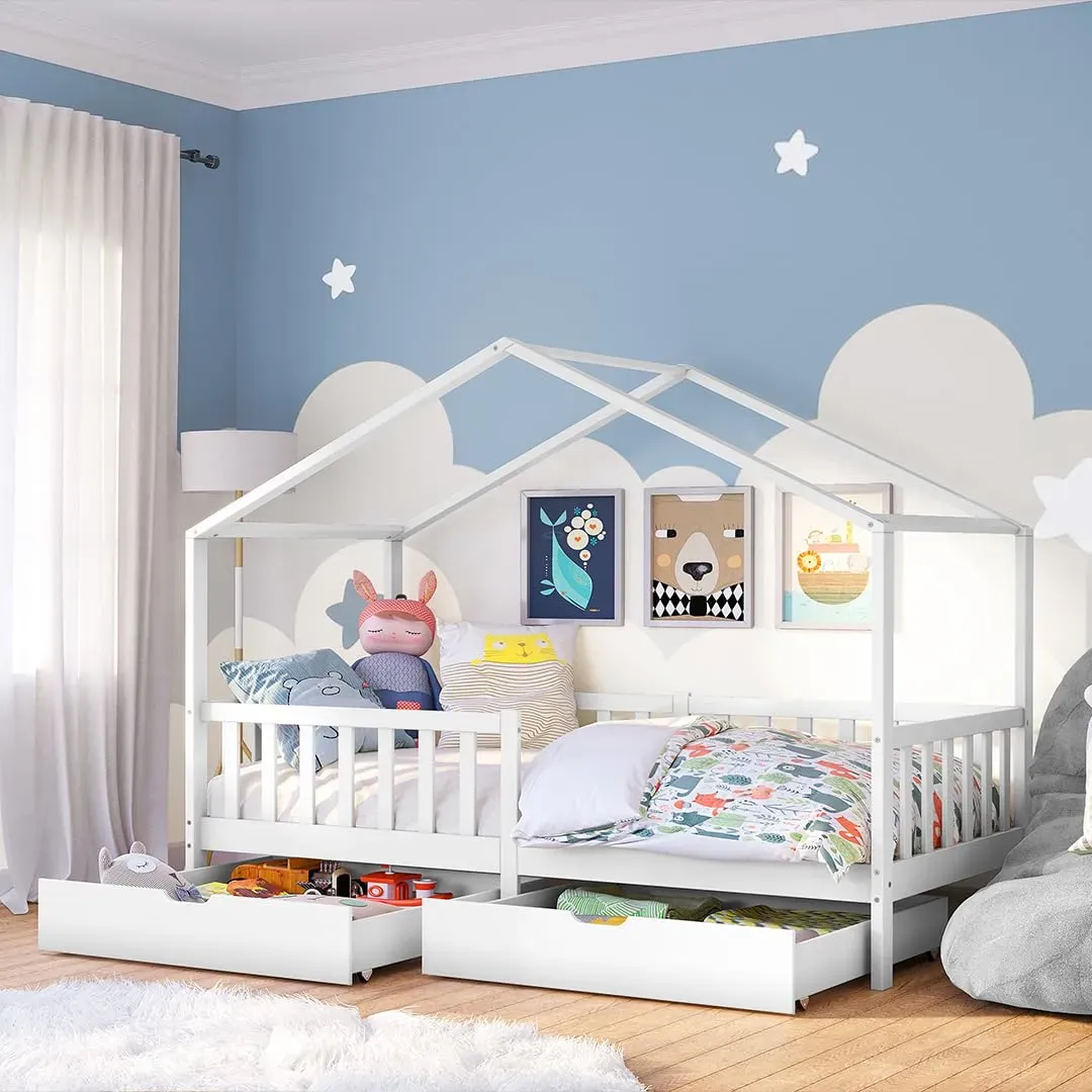 Zustand: Neu - Kleinkindbetten - HESHU - 4K3K-50620 - - [Massive Kiefer] Die Betten sind aus massivem Kiefernholz, europäische Qualität, um die Sicherheit von Kindern und Eltern zu gewährleisten. Unsere Farbe ist zertifiziert und ungefährlich, mit speichelfester und wasserbasierter [Spezielle Fenster] Einzigartige Fenster sorgen für Interesse und Schönheit und fungieren gleichzeitig als Zaun. Mit Schlosseingängen für junge Prinzessinnen und Prinzen, oder Kinderbetten mit Dächern und Fenstern, Höhlenarchitektur. Die Optik ist durch die leicht sichtbare Holzmaserung natürlich. [Für die Kleinen Entwicklt] Ab jetzt haben unsere Kleinen ihr eigenes kleines Haus -das Abenteuerbett wird ein Highlight im Kinderzimmer. Dein Mädchen/Junge wird strahlen vor Freude. Sie können auch Zelte aufstellen, Ihre Kinder können mit ihren Freunden oder Geschwistern Verstecken spielen und sich einen sicheren und gesunden Schlaf leisten. [ Großer 2-teiliger Bettkasten] Die beiden 77.5×82×19.5 cm großen Schubladen bieten viel Stauraum für Bettwäsche, Spielzeug & Klamotten; großräumige Kästen mit Rollen und Griffmulde leicht zu öffnen, oder ausreichend Platz darunter Staub zu saugen. Die Bettengröße ist auch für kleine Räume geeignet [Montage erforderlich] Stabile Bauweise und leichte Montage. Im Lieferumfang enthalten sind das Design Kinderbett inkl. Lattenrost und Schublade und eine bebilderte Montageanleitung samt benötigtem Montagematerial. - Verkäufer: AMZtangmeirong im amazon.de ... Das VitaliSpa Hausbett in Weiß ist eine schlichte und funktionale Wahl mit zwei Schubladen für zusätzlichen Stauraum. ![]() ![]() VitaliSpa Hausbett, Weiß, Holzwerkstoff, 2 Schubladen, Rechteckig, 80x160 cm, Kinder- & Jugendzimmer, Kindermöbel, Kinderbetten, Hausbetten