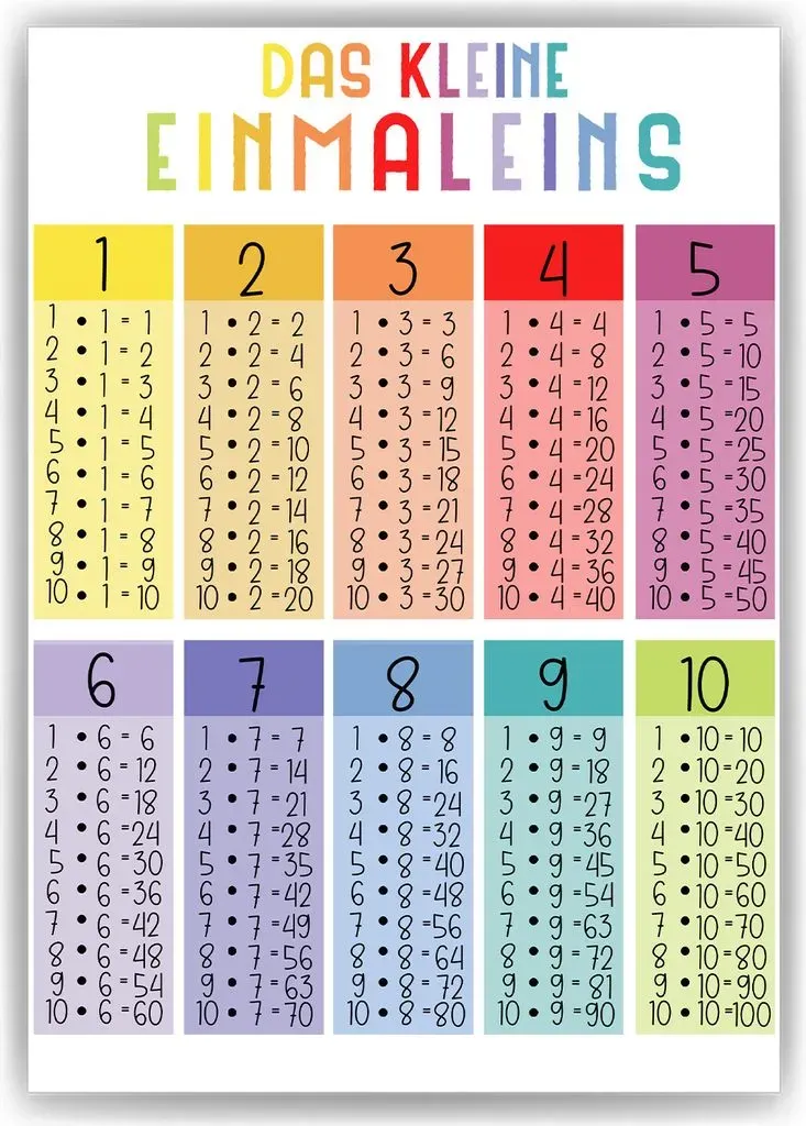 16 Händlerangebote bei billiger.de - Kategorie: Gesellschaftsspiele - Schmidt Spiele - Flexible Gestaltung Qualität/Haltbarkeit Langlebig Robustheit, Hersteller: Schmidt Spiele GmbH - GTIN:4001504405557 Dieses Lernposter zum Einmaleins ist eine praktische Lernhilfe für Kinder im Grundschulalter. ![]() ![]() tigerlino 1x1 Kinderposter Einmaleins Lernposter Mathematik Kinderzimmer Wandbild Kindergarten Grundschule Kinder Lernhilfe Poster DIN A3 (29.7x42cm)