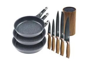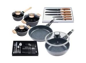 Küchenutensilien Wohnen - - Das Set beinhaltet zwei hochwertige Bratpfannen KING® Click-Grip Moonscape: Eine flache Bratpfanne (28cm / ca. 5.5cm hoch) und eine tiefe Bratpfanne (28cm / ca. 8.5cm hoch) mit Glasdeckel. Der Glasdeckel lässt sich sowohl auf der flachen als auch auf der tiefen Bratpfanne problemlos verwenden. Die Bratpfannen KING® CLICK-GRIP MOONSCAPE® sind aus hochwertigem Aluguss und besonders robust. Die Pfannengriffe lassen sich über einen magnetischen Klickmechanismus problemlos abnehmen. Die keramische Antihaft-Beschichtung ist in sich und an Ihrer Oberfläche mehrfach verstärkt und daher extrem langlebig. Die zusätzlich verstärkte raue Oberflächenstruktur macht die Beschichtung widerstandsfähiger, erhöht den Antihaft-Effekt erheblich und ermöglicht einen dauerhaften Einsatz unter rauen Bedingungen. Hitzebeständigkeit Pfannen: 180°C mit Deckel und Griffen. 240°C ohne Deckel und Griffe. Zum Set gehören drei hochwertige Kochtöpfe (18cm -1.5L, 20cm -2 L, 24cm - 4L), aus hochwertigem Aluminiumguss, mit dazugehörigen Glasdeckeln. Die Töpfe sind mit der besonders langlebigen Antihaft-Keramikbeschichtung FUSION® von WHITFORD ausgestattet. Die Keramikbeschichtung ist besonders widerstandsfähig und hat einen geringen Verschleiß. Die Keramikbeschichtung schützt die Töpfe vor Kratzern und Abrieb und fördert somit die Langlebigkeit. Da hierdurch weniger Fett zum Anbraten benötigt wird, ist das Kochen mit den Keramik beschichteten Kochtöpfen besonders bekömmlich. Zudem ... Dieses umfangreiche graue Pfannen-Set mit Töpfen, Glasdeckeln, Messern und Besteckset ist ein Komplettpaket für die Küche. ![]() 366994 / DE- Billiger- baur.de Pfannen-Set KING 'Moonscape', grau, Pfannen, Induktion, (Töpfe+Glasdeckel, Pfannen+Deckel,Messer,Besteckset)