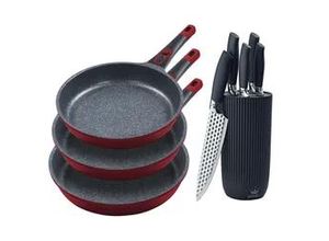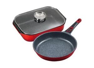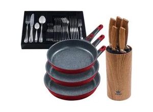 Küchenutensilien Wohnen - - Das hochwertige Bratpfannenset KING® MOONSCAPE beinhaltet drei flache Bratpfannen (20, 24, 28 cm). Die Bratpfannen KING® CLICK-GRIP MOONSCAPE® sind aus hochwertigem Aluguss und besonders robust. Die Pfannengriffe lassen sich über einen magnetischen Klickmechanismus problemlos abnehmen. Die keramische Antihaft-Beschichtung ist in sich und an Ihrer Oberfläche mehrfach verstärkt und daher extrem langlebig. Die zusätzlich verstärkte raue Oberflächenstruktur macht die Beschichtung widerstandsfähiger, erhöht den Antihaft-Effekt erheblich und ermöglicht einen dauerhaften Einsatz unter rauen Bedingungen. Perfekt für Profis, die der Haltbarkeit Ihrer Pfannen einiges abverlangen. Die Bratpfannen KING® CLICK-GRIP MOONSCAPE sind für alle Herdarten geeignet, auch für INDUKTION. Hitzebeständigkeit Bratpfannen: Bis 180°C mit Griff und Deckel, bis 240°C ohne Griff und Deckel. Achtung Verbrennungsgefahr: Bei der Verwendung im Backofen erhitzen sich sämtliche Bestandteile der Bratpfannen. Reinigen deine Bratpfannen immer per Handwäsche - mehrmalige Spülmaschinenwäsche kann die Beschichtung beschädigen. Beschädigungen in der Beschichtung beeinträchtigen die Antihaft-Funktion und machen die Bratpfanne unnutzbar. Vermeide laugenhaltige und starke Reinigungsmittel (z.B. Geschirrspülerreiniger). Diese greifen das Aluminium an und verfärben dieses Schwarz. Im Set ebenfalls enthalten:: Das KING® Messerset ESSENTIAL ist der absolute Blickfang in deiner Küche. Die ... Dieses rote Pfannen-Set mit abnehmbarem Griff ist eine gute Option für alle, die ein größeres Set bevorzugen. ![]() 366994 / DE- Billiger- baur.de Pfannen-Set KING 'Moonscape', rot, Ø:28cm, Pfannen, abnehmbarer Griff, MOONSCAPE-Beschichtung, Induktion