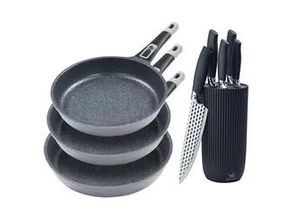 Küchenutensilien Wohnen - - Das hochwertige Bratpfannenset KING® MOONSCAPE beinhaltet drei flache Bratpfannen (20, 24, 28 cm). Die Bratpfannen KING® CLICK-GRIP MOONSCAPE® sind aus hochwertigem Aluguss und besonders robust. Die Pfannengriffe lassen sich über einen magnetischen Klickmechanismus problemlos abnehmen. Die keramische Antihaft-Beschichtung ist in sich und an Ihrer Oberfläche mehrfach verstärkt und daher extrem langlebig. Die zusätzlich verstärkte raue Oberflächenstruktur macht die Beschichtung widerstandsfähiger, erhöht den Antihaft-Effekt erheblich und ermöglicht einen dauerhaften Einsatz unter rauen Bedingungen. Perfekt für Profis, die der Haltbarkeit Ihrer Pfannen einiges abverlangen. Die Bratpfannen KING® CLICK-GRIP MOONSCAPE sind für alle Herdarten geeignet, auch für INDUKTION. Hitzebeständigkeit Bratpfannen: Bis 180°C mit Griff und Deckel, bis 240°C ohne Griff und Deckel. Achtung Verbrennungsgefahr: Bei der Verwendung im Backofen erhitzen sich sämtliche Bestandteile der Bratpfannen. Reinigen deine Bratpfannen immer per Handwäsche - mehrmalige Spülmaschinenwäsche kann die Beschichtung beschädigen. Beschädigungen in der Beschichtung beeinträchtigen die Antihaft-Funktion und machen die Bratpfanne unnutzbar. Vermeide laugenhaltige und starke Reinigungsmittel (z.B. Geschirrspülerreiniger). Diese greifen das Aluminium an und verfärben dieses Schwarz. Im Set ebenfalls enthalten:: Das KING® Messerblockset CONIC ist der absolute Blickfang in deiner Küche. Die ... Dieses Pfannen-Set bietet ein gutes Preis-Leistungs-Verhältnis für ein Set mit abnehmbarem Griff und Induktionsfähigkeit. ![]() 366994 / DE- Billiger- baur.de Pfannen-Set KING 'Moonscape', grau, Ø:28cm, Pfannen, abnehmbarer Griff, MOONSCAPE-Beschichtung, Induktion