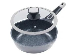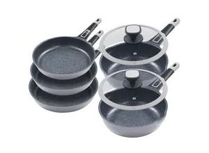 Küchenutensilien Wohnen - - Das hochwertige Bratpfannenset KING® MOONSCAPE beinhaltet drei flache Bratpfannen (20, 24,28 cm) und zwei tiefe Bratpfannen (24, 28 cm - je mit Glasdeckel). Die Bratpfannen KING® CLICK-GRIP MOONSCAPE® sind aus hochwertigem Aluguss und besonders robust. Die Pfannengriffe lassen sich über einen magnetischen Klickmechanismus problemlos abnehmen. Die keramische Antihaft-Beschichtung ist in sich und an Ihrer Oberfläche mehrfach verstärkt und daher extrem langlebig. Die zusätzlich verstärkte raue Oberflächenstruktur macht die Beschichtung widerstandsfähiger, erhöht den Antihaft-Effekt erheblich und ermöglicht einen dauerhaften Einsatz unter rauen Bedingungen. Perfekt für Profis, die der Haltbarkeit Ihrer Pfannen einiges abverlangen. Die Bratpfannen KING® CLICK-GRIP MOONSCAPE sind für alle Herdarten geeignet, auch für INDUKTION. Hitzebeständigkeit Bratpfannen: Bis 180°C mit Griff und Deckel, bis 240°C ohne Griff und Deckel. Achtung Verbrennungsgefahr: Bei der Verwendung im Backofen erhitzen sich sämtliche Bestandteile der Bratpfannen. Reinigen deine Bratpfannen immer per Handwäsche - mehrmalige Spülmaschinenwäsche kann die Beschichtung beschädigen. Beschädigungen in der Beschichtung beeinträchtigen die Antihaft-Funktion und machen die Bratpfanne unnutzbar. Vermeide laugenhaltige und starke Reinigungsmittel (z.B. Geschirrspülerreiniger). Diese greifen das Aluminium an und verfärben dieses Schwarz., Material: Material Pfanne: Aluminiumguss, ... Dieses 11-teilige Pfannen-Set ist eine sehr umfassende Option für alle, die eine große Auswahl an Kochgeschirr benötigen. ![]() ![]() King Moonscape Pfannen-Set 11-tlg. 20 cm + 24 cm + 28 cm
