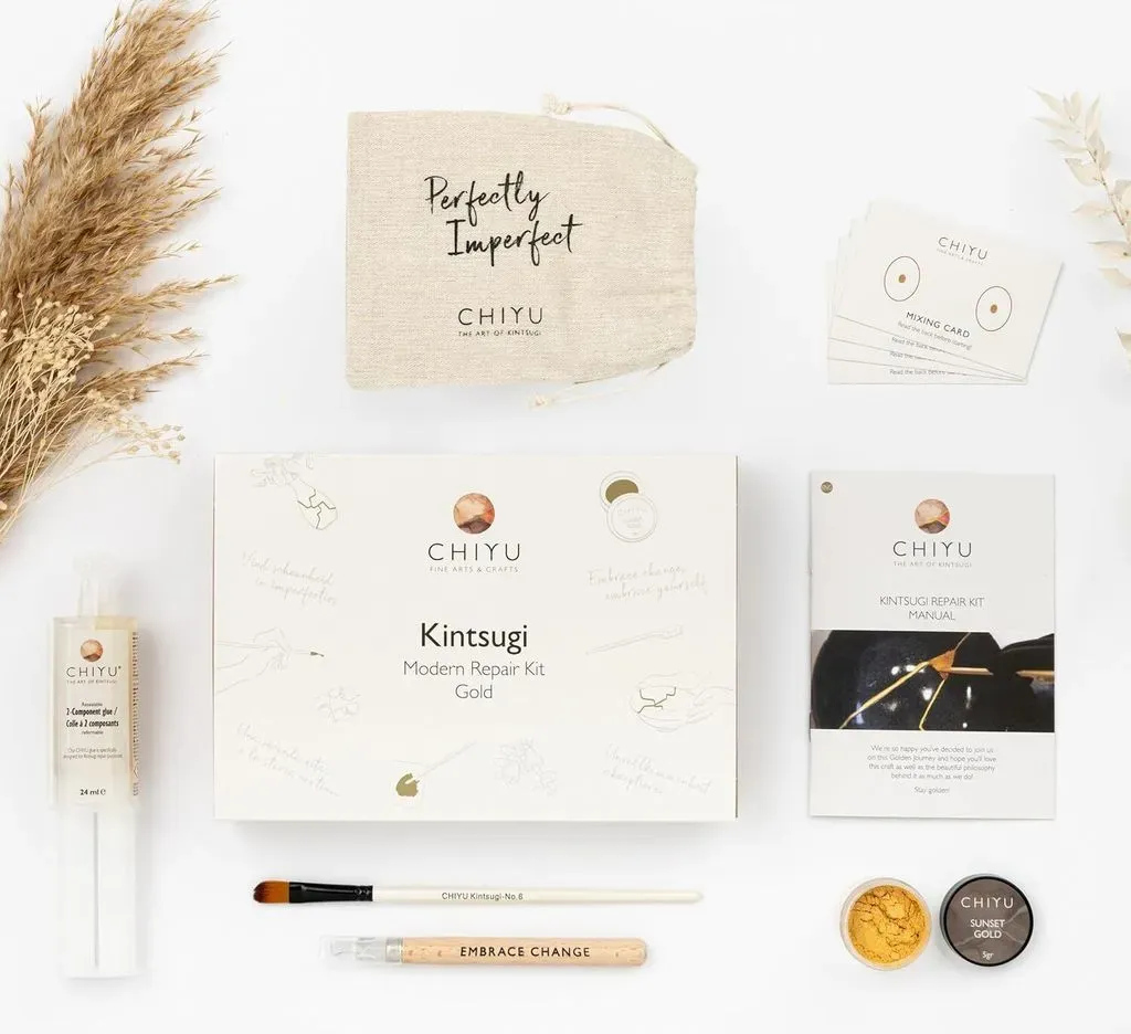 Kategorie: Bücher - chiyu kintsugi - GTIN:5419980149800 - KINTSUGI: Die japanische Kunst, zerbrochene Gegenstände mit Goldlack zu restaurieren, um sie schöner und einzigartiger zu machen, nicht trotz, sondern dank ihrer Goldrisse. EINZIGARTIGES HARZ: Das CHIYU-harz ist speziell für die Verwendung von Kintsugi entwickelt worden und das einzige seiner Art. Es wird aus der Schale von Cashewnüssen hergestellt. Dies macht das Material langlebig, natürlich und gleichzeitig sehr stark. EINFACH ZU BENUTZEN: Mit der beiliegenden Gebrauchsanweisung (Das Handbuch ist in Englisch, aber Sie können problemlos 5 weitere Sprachen über den QR-Code herunterladen (DE FR IT NL ES)) können Sie 8 bis 10 mittelgroße zerbrochene Gegenstände problemlos und sehr sicher reparieren. Nachdem Sie den Bio-Goldkleber hergestellt haben, kleben Sie die zerbrochenen Teile zusammen und verwenden Sie den Pinsel, um das Goldpulver leicht aufzutragen. GEEIGNET FüR VERSCHIEDENE MATERIALIEN: Funktioniert sowohl auf Keramik als auch auf Gegenständen aus Glas, Holz, Marmor oder Beton. Die Epoxid-Knetpaste eignet sich hervorragend zum Auffüllen von fehlenden Materialstücken. Ein kompletteres Paket können Sie nicht bekommen! SPüLMASCHINENSICHER: Das CHIYU-Harz und die Epoxidpaste härten innerhalb von 5 10 Minuten aus. Dann können sie in die Spülmaschine! Dadurch eignet sich das CHIYU Kintsugi Repair Kit auch sehr gut als Geschenk. Es ist ein schönes Geschenkset., Hersteller: CHIYU Kintsugi - 39,95 Euro bei Amazon ... Dieses Deluxe Bio Kintsugi Reparatur Set enthält Gold, Silber und Kupfer und ist biobasiert sowie lebensmittelecht für vielseitige Reparaturen. ![]() ![]() CHIYU Bio Kintsugi Reparatur Set: Deluxe Box - Gold, Silber & Kupfer Goldkleber - Biobasiert Lebensmittelecht - Das vollständigste und haltbarste Set