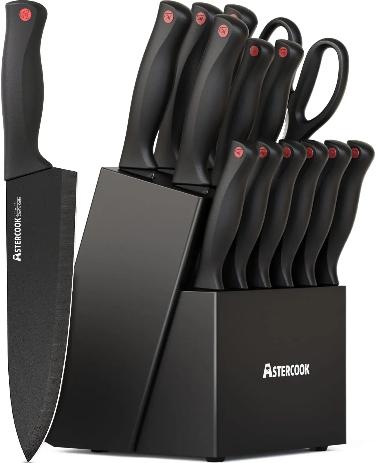 keine Angabe Gewöhnlich versandfertig in 7 bis 8 TagenAstercook 15 Piece Knife Set with Sharpener Block - German Stainless Steel, Dishwasher Safe Kitchen Knives with Built-In Sharpener, Black