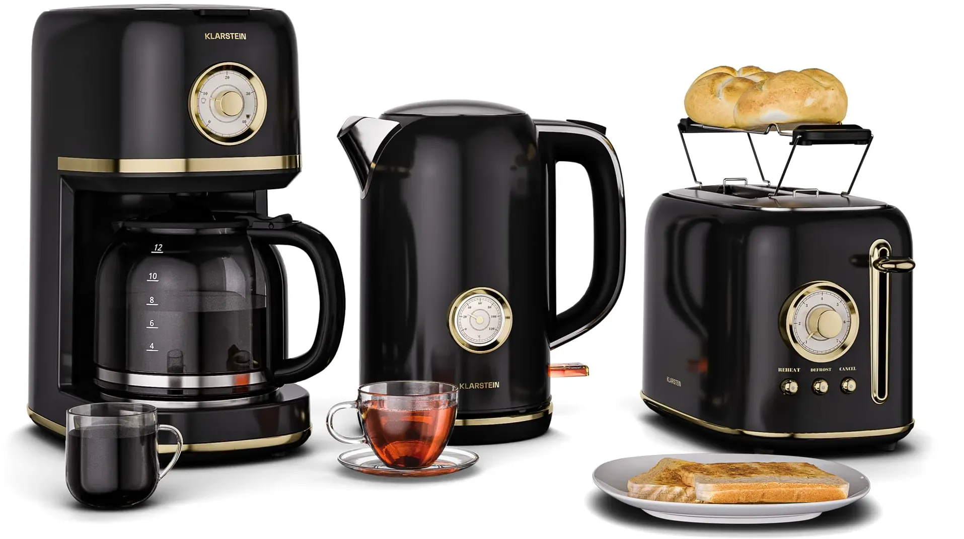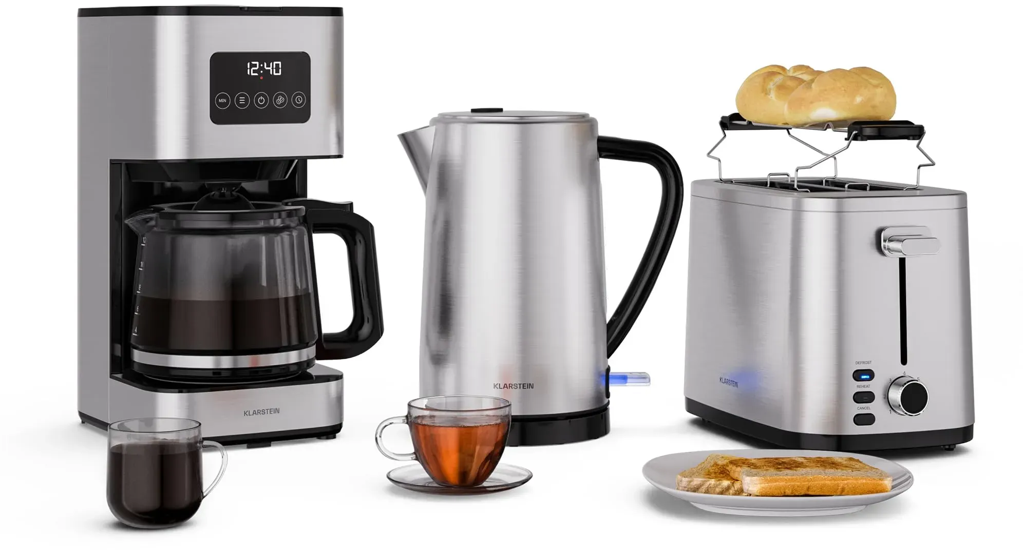 Verfügbarkeit: Auf Lager - Kategorie: Wasserkocher - Klarstein - GTIN:4060656565250 - VIELSEITIGES FRüHSTüCKSSET: Genieße knusprigen Toast, heißen Tee aus dem Wasserkocher und frisch gebrühten Kaffee aus der Filterkaffeemaschine €“ für einen perfekten Start in den Tag. EINFACHE BEDIENUNG: Alle drei Geräte verfügen über benutzerfreundliche Bedienelemente €“ stell die Bräunungsstufe des Toasters ein, bediene den Wasserkocher ganz entspannt und bereite Kaffee mühelos zu, für einen entspannten Start in den Tag. EINHEITLICHES VICTORIA-DESIGN: Retro-inspirierte Formen mit glänzenden Akzenten und dezenten goldfarbenen Details ergeben ein harmonisches Frühstücksset, das zeitlose Eleganz mit einer einheitlichen, stilvollen Küchenästhetik verbindet. FLEXIBLE BRäUNUNG: Mit 7 Bräunungsstufen toastest du 2 Scheiben Brot im Toaster ganz nach deinem Geschmack €“ perfekt für verschiedene Brotsorten beim Frühstück. MEHRKANNENBETRIEB: Die Filterkaffeemaschine bereitet bis zu 12 Tassen auf einmal zu €“ perfekt für stressige Morgen oder wenn du Freunde und Familie einlädst. - 140,99 Euro bei Amazon Marketplace Kitchen - gefunden von billiger.de Das Verosteel Frühstücksset mit Toaster, Wasserkocher und Kaffeemaschine ist ein umfassendes Paket für den täglichen Gebrauch. ![]() Klarstein Verosteel Frühstücksset | Toaster, Wasserkocher, Kaffeemaschine | 12 Tassen 60003286