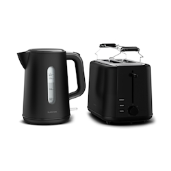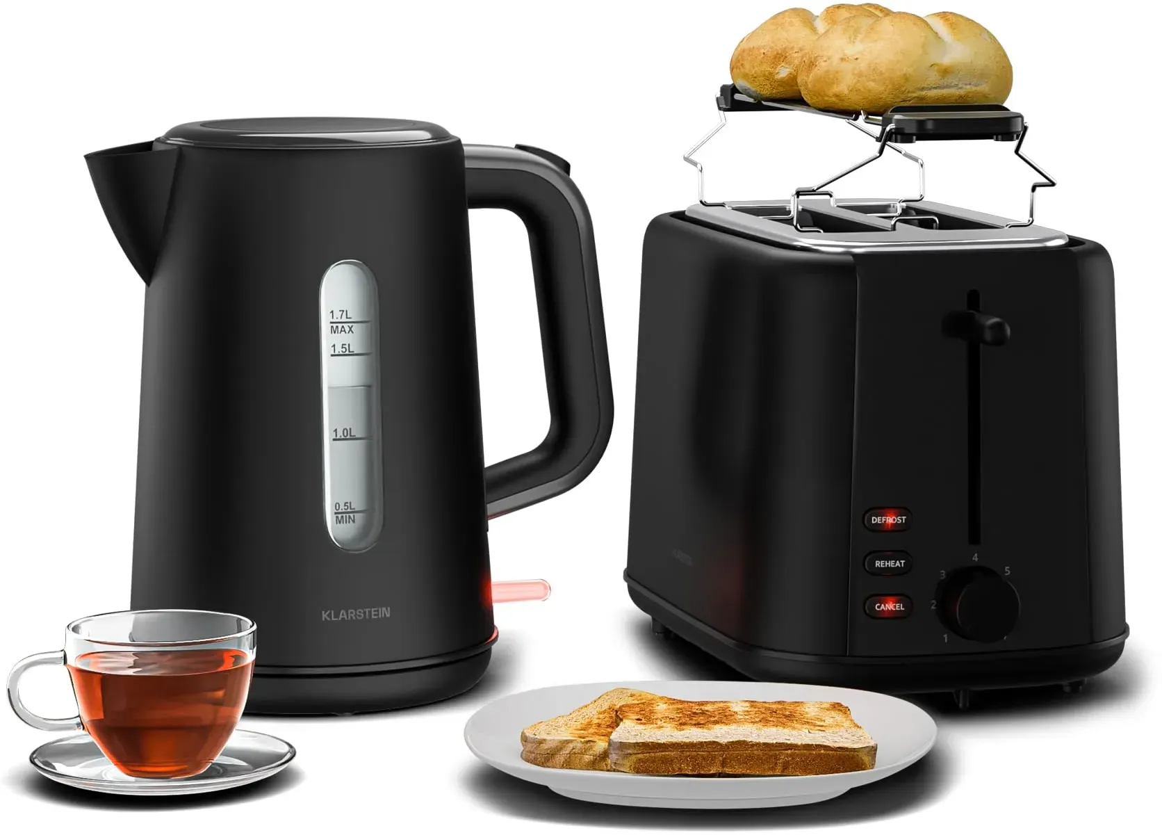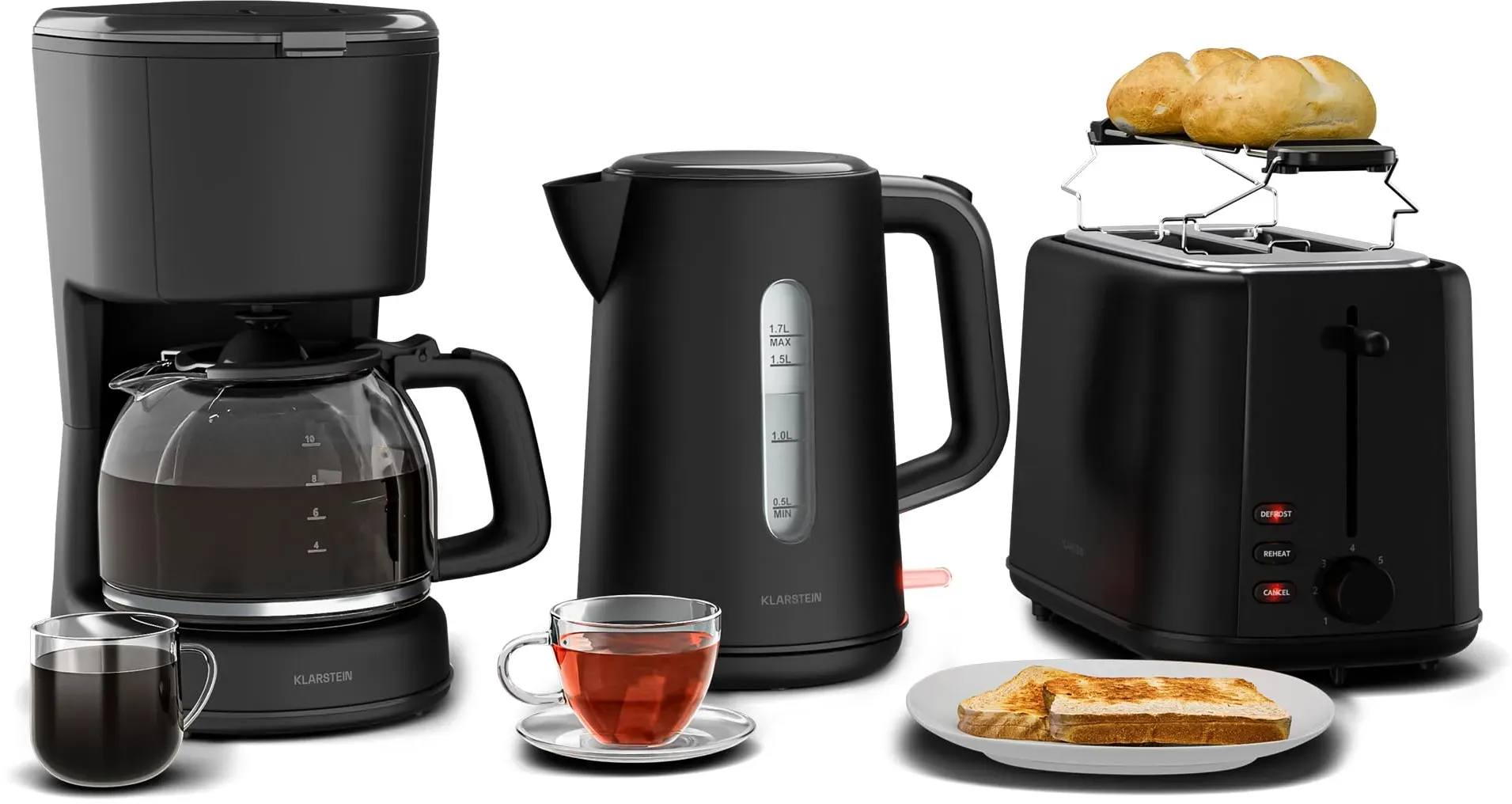 Zustand: Neu - Wasserkocher & Toaster Sets - Klarstein - 10047379+10047380 - EAN: 4060656564871 - PERFEKTE BRÄUNUNG: Mit 7 einstellbaren Stufen passt sich der Toaster jedem Brot an und sorgt so für dein individuelles Frühstückserlebnis. SCHNELLES KOCHEN: Mit seinem großzügigen Fassungsvermögen von 1,7 l bringt dieser Wasserkocher Wasser im Handumdrehen zum Kochen - perfekt für eine Tasse allein oder gemeinsam mit Freunden. EINFACHE REINIGUNG: Die herausnehmbare Krümelschublade und die robusten Oberflächen machen deinen Toaster für 2 Scheiben im Frühstücksset schnell und unkompliziert sauber. PRAKTISCHE BEDIENUNG DES WASSERKESSELS: Einfaches Befüllen über den Auslauf oder den großen Deckel, mit LED-Ein-/Aus-Anzeige für eine schnelle Statusüberprüfung. Der kabellose 360°-Drehfuß ermöglicht dir ein bequemes Anheben und Abstellen aus jedem Winkel. EINHEITLICHES VELAIRE-DESIGN: Schlanke, glänzende Akzente und eine strukturierte Oberfläche ergeben ein harmonisches Frühstücksset, das deiner Küche minimalistische Eleganz verleiht. - Verkäufer: Klarstein Deutschland im amazon.de Marketplace Dieses Basis-Frühstücksset bietet einen 2-Schlitz-Toaster und einen Wasserkocher in Schwarz zu einem attraktiven Preis. ![]() Velaire Basis-Frühstücksset | 2-Schlitz-Toaster Wasserkocher | 800 W | 1,7 l Schwarz Klarstein