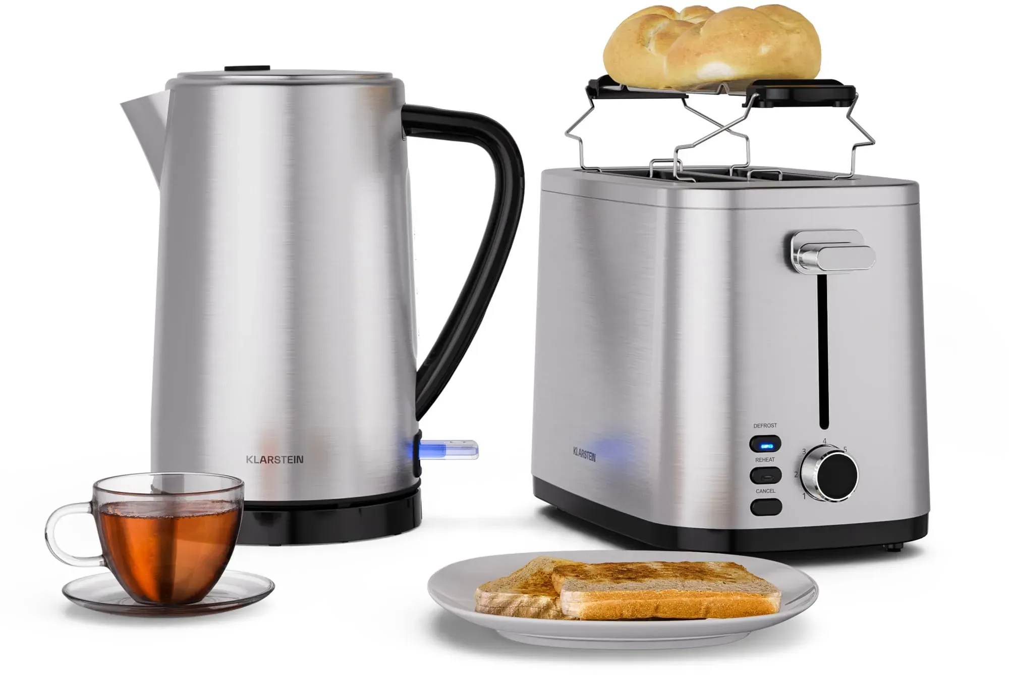 EAN: 4060656564857 - Das Klarstein Verosteel Basis-Frühstücksset überzeugt mit hochwertigem Edelstahl und dezenten schwarzen Glanzelementen. Damit fügt es sich nahtlos in moderne Räumlichkeiten ein. Dieses Frühstücksset ist Teil der Verosteel-Designserie und verkörpert Minimalismus, Ruhe und klare Geometrie. Damit ist es eine natürliche Ergänzung jeder gut ausgestatteten Küche. Das Set besteht aus einem 2-Schlitz-Toaster mit 800 W Leistung und einem Wasserkocher mit einem Fassungsvermögen von 1,7 Litern. Der Toaster zeichnet sich durch 7 verschiedene Bräunungslevel aus und verfügt über einen Brötchenaufsatz zum Aufbacken von Brötchen und Croissants. Der Wasserkocher mit einer Leistung von bis zu 2200 W ist mit einem integrierten Kalkfilter ausgestattet. Du möchtest deine Küche mit schlichter Eleganz einheitlich einrichten? Entdecke jetzt unsere gesamte Verosteel-Geräteauswahl und kreiere ein elegant-harmonisches Küchenerlebnis! - bei klarstein.de - aus Yadore Produktdaten Dieses Victoria Basis-Frühstücksset von Klarstein.de bietet einen 2-Schlitz-Toaster und Wasserkocher zu einem fairen Preis. ![]() Klarstein Victoria Basis-Frühstücksset | 2-Schlitz-Toaster & Wasserkocher 60003295
