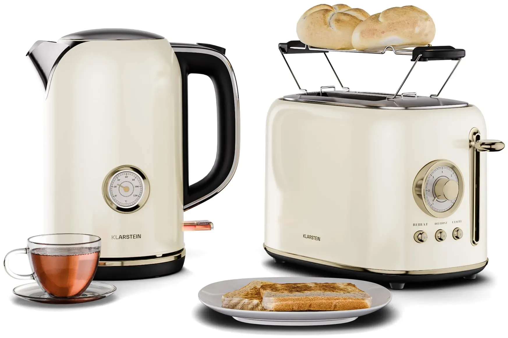 Verfügbarkeit: Auf Lager - Kategorie: Wasserkocher - Klarstein - GTIN:4060656565359 - PERFEKTE BRäUNUNG: Mit 7 einstellbaren Stufen passt sich der Toaster jeder Brotsorte an und sorgt für ein individuelles Frühstückserlebnis. SCHNELLES KOCHEN: Mit seinem großzügigen Fassungsvermögen von 1,7 l bringt dieser Wasserkocher Wasser im Handumdrehen zum Kochen €“ perfekt für eine Tasse allein oder gemeinsam mit Freunden. EINFACHE REINIGUNG: Die herausnehmbare Krümelschublade und die robusten Oberflächen machen deinen Toaster für 2 Scheiben im Frühstücksset schnell und unkompliziert sauber. PRAKTISCHE BEDIENUNG DES WASSERKESSELS: Einfaches Befüllen über den Auslauf oder den großen Deckel, mit LED-Ein-/Aus-Anzeige für eine schnelle Statusüberprüfung. Der kabellose 360°-Drehfuß ermöglicht dir ein bequemes Anheben und Abstellen aus jedem Winkel. EINHEITLICHES VICTORIA-DESIGN: Retro-Kurven, glänzende Akzente und dezente goldfarbene Details ergeben ein stimmiges Frühstücksset, das deiner Küche zeitlose Eleganz verleiht. - 88,99 Euro bei Amazon Marketplace Kitchen - gefunden von billiger.de Das Victoria Set in Cream bietet ebenfalls ein charmantes Retro-Design und alle wichtigen Funktionen. ![]() ![]() Klarstein Victoria Toaster Wasserkocher Set, Retro Design, 2 Scheiben Toaster mit 7 Bräunungsstufen & Brötchenaufsatz, 1,7L Wasserkocher mit Kalkfilter, Frühstücksset, Cream