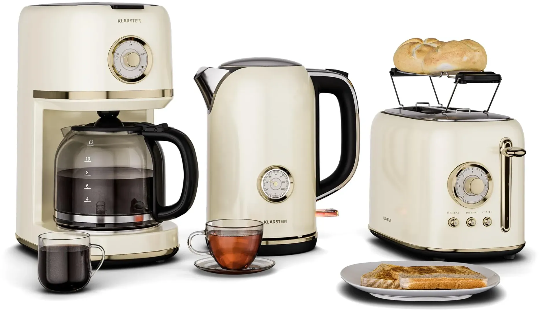 Verfügbarkeit: Auf Lager - Kategorie: Wasserkocher - Klarstein - GTIN:4060656565366 - VIELSEITIGES FRüHSTüCKSSET: Genieße knusprigen Toast, heißen Tee aus dem Wasserkocher und frisch gebrühten Kaffee aus der Filterkaffeemaschine €“ für einen perfekten Start in den Tag. EINFACHE BEDIENUNG: Alle drei Geräte verfügen über benutzerfreundliche Bedienelemente €“ stell die Bräunungsstufe des Toasters ein, bediene den Wasserkocher ganz entspannt und bereite Kaffee mühelos zu, für einen entspannten Start in den Tag. EINHEITLICHES VICTORIA-DESIGN: Retro-inspirierte Formen mit glänzenden Akzenten und dezenten goldfarbenen Details ergeben ein harmonisches Frühstücksset, das zeitlose Eleganz mit einer einheitlichen, stilvollen Küchenästhetik verbindet. FLEXIBLE BRäUNUNG: Mit 7 Bräunungsstufen toastest du 2 Scheiben Brot im Toaster ganz nach deinem Geschmack €“ perfekt für verschiedene Brotsorten beim Frühstück. MEHRKANNENBETRIEB: Die Filterkaffeemaschine bereitet bis zu 12 Tassen auf einmal zu €“ perfekt für stressige Morgen oder wenn du Freunde und Familie einlädst. - 135,99 Euro bei Amazon Marketplace Kitchen - gefunden von billiger.de Dieses vollständige Victoria Frühstücksset in Cream inklusive Kaffeemaschine ist perfekt für eine umfassende Küchenausstattung. ![]() ![]() Klarstein Victoria Vollständiges Frühstücksset €“ Toaster 2 Scheiben mit Brötchenaufsatz, Wasserkocher 1,7L, Filterkaffeemaschine 12 Tassen, Retro Design, Warmhaltefunktion, Cream