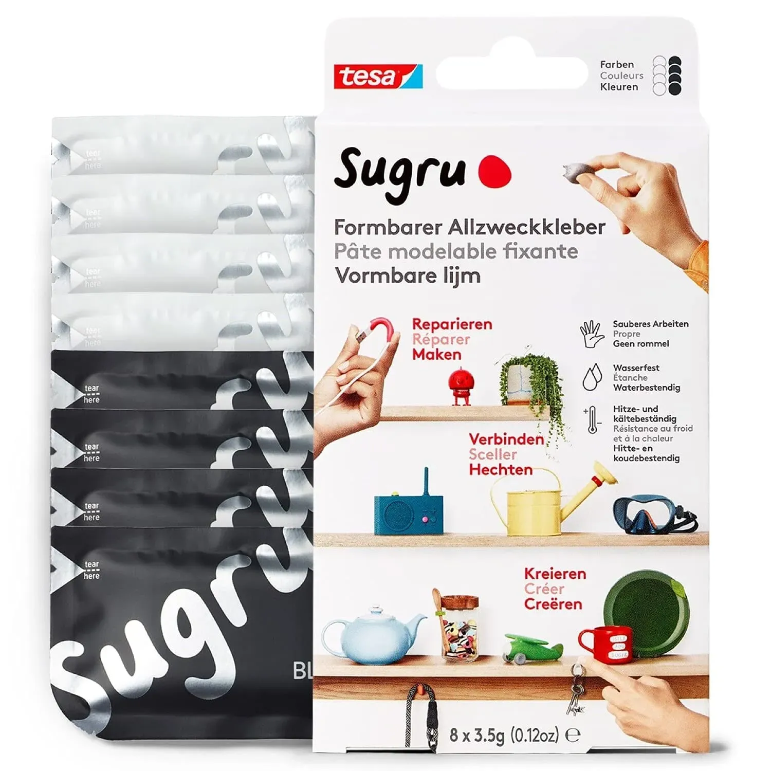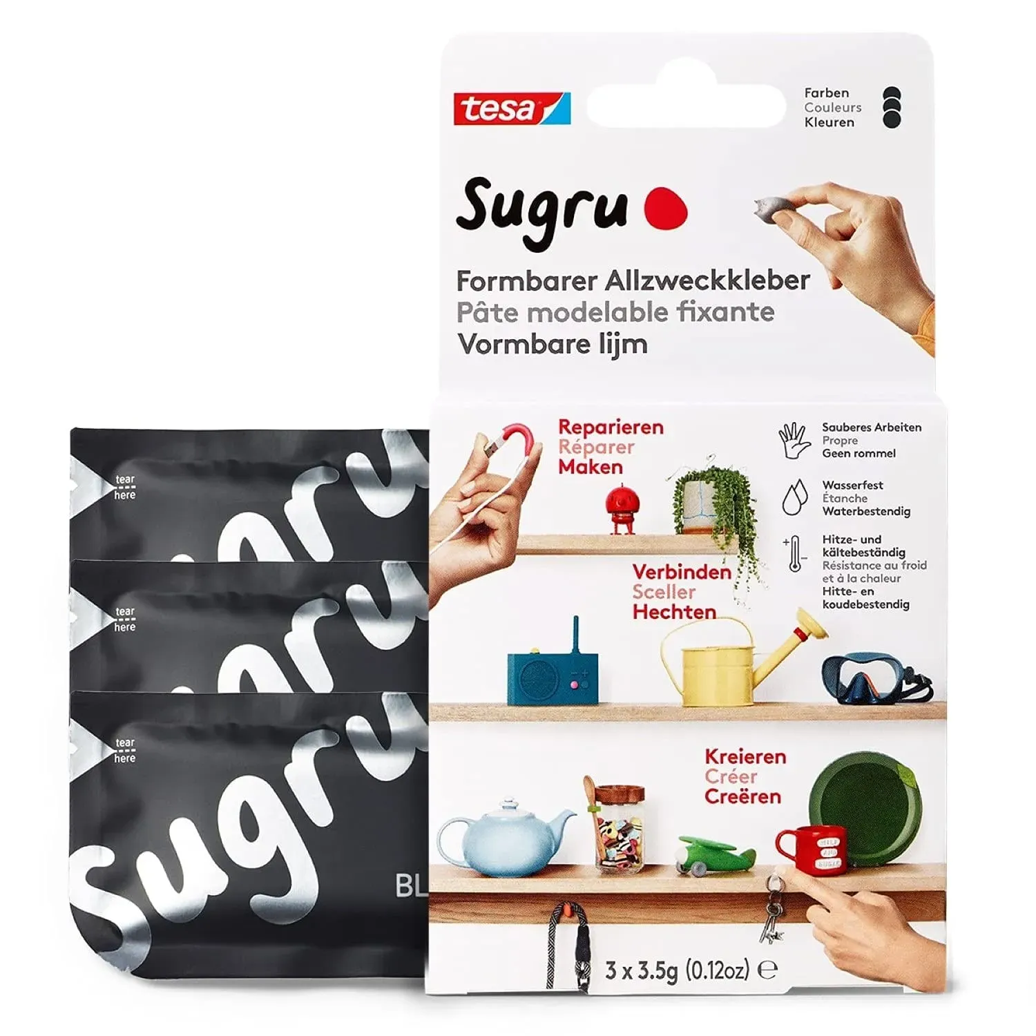 Zustand: Gebraucht - 1,94 € / Stück - Universalkleber - sugru tesa - I000953 - EAN: 4063565067044 - Knetbarer Alleskleber für vielfältige DIY-Anwendungen: Zum Reparieren, Kleben, Montieren, Versiegeln sowie für vieles mehr - die Reparaturknete wird einfach mit den Fingern zur gewünschten Anwendung geformt Universeller Einsatz: Zur Reparatur des Gartenschlauchs oder der Waschmaschinen-Dichtung, zum Abdichten in Bad oder Küche, zur Spielzeug-Reparatur und zum Ummanteln defekter Smartphone-Ladekabel Ungiftig, hautfreundlich und praktisch: Die Klebeknete enthält keine Stoffe, die schädlich für die Haut sind - die Konsistenz der Masse erlaubt saubere Ergebnisse und lässt sich bei Bedarf entfernen Leistungsstark und universal - Indoor und Outdoor nutzbar: Hält bis zu 2 kg Belastung - wasserfest sowie UV- und temperaturbeständig, spülmaschinenfest - Ideal für Anwendungen in Haus und Garten Für viele Materialien wie Glas, Keramik, Holz, Metall und Kunststoffe geeignet - einfache Anwendung: bis zu 30 Minuten die Klebeknete nach Bedarf formen - nach dem Fixieren 24 Stunden aushärten lassen - 1 Händler im amazon.de Marketplace Dieses Sugru-Set in Schwarz ist perfekt für diskrete Reparaturen und Befestigungen, wo eine unauffällige Farbe gewünscht ist. ![]() ![]() Sugru by tesa - Formbarer Allzweckkleber, 3er-Pack, 3 x 3,5 g, Schwarz - vielseitige Klebeknete - zum Dekorieren, Kleben, Reparieren und für kreative DIY-Anwendungen