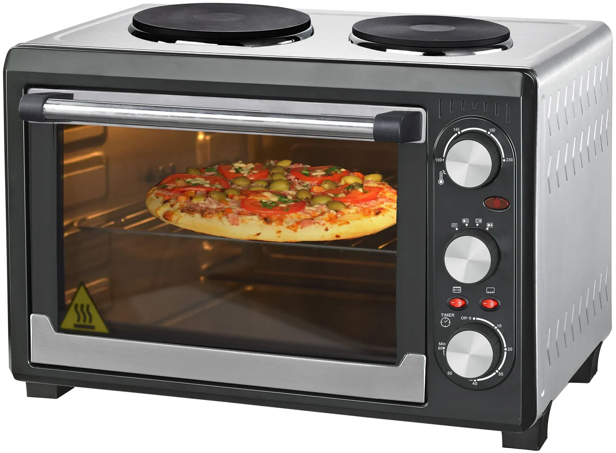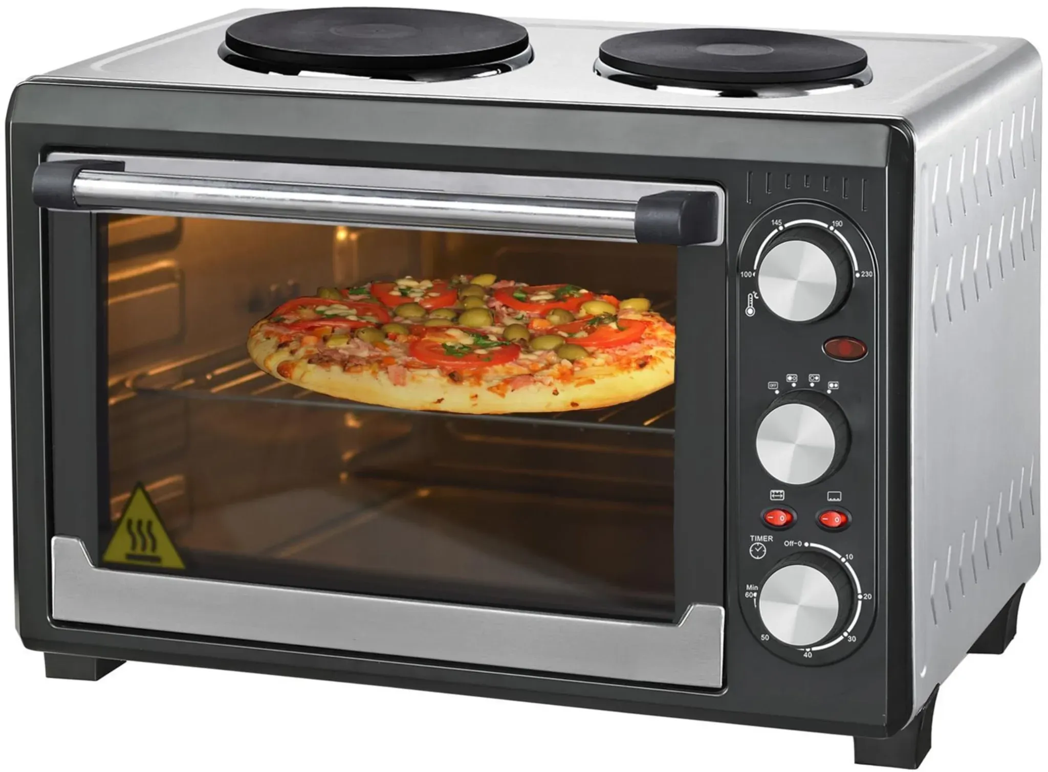 2 Händlerangebote bei billiger.de - Kategorie: Miniöfen - Hanseatic - Der Hanseatic Mini Backofen HMO366BKB ist eine kleine Kompaktküche. Sie kann sowohl beim Campen als auch in einer kleinen Single Küche verwendet werden. Mit 2 Herdplatten und einem Ofen mit Oberhitze, Unterhitze, Umluft und Drehspieß bieten sich hier vielfältige Möglichkeiten für das Kochen und Backen. Eine perfekte Miniküche im kleinen Format. Durch die Doppelverglasung wird das Sichtfenster nicht heiß. Der Mini Ofen findet durch seine geringen Gerätemaße fast an jeden Ort eine Platz. - GTIN:4029686447417 ![]() ![]()