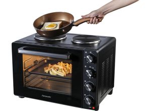 Backöfen Herde Wohnen Küchen - - Der Hanseatic Mini Backofen HMO366BKB ist eine kleine Kompaktküche. Sie kann sowohl beim Campen als auch in einer kleinen Single Küche verwendet werden. Mit 2 Herdplatten und einem Ofen mit Oberhitze, Unterhitze, Umluft und Drehspieß bieten sich hier vielfältige Möglichkeiten für das Kochen und Backen. Eine perfekte Miniküche im kleinen Format. Durch die Doppelverglasung wird das Sichtfenster nicht heiß. Der Mini Ofen findet durch seine geringen Gerätemaße fast an jeden Ort eine Platz., Allgemein: Weitere Vorteile: Vielseitige Funktionen: 6 verschiedene Einstellungen für unterschiedliche Koch- und Backanforderungen., Gute übersicht: Beleuchteter Ofen für optimale Sicht während des Kochens., Umfangreiches Zubehör: Inklusive Backblech, Grillrost, Rotationsspieß, Krümelblech und Entnahmegriffe., Flexible Heizoptionen: Ober- und Unterhitze, Umluft sowie Grillspieß., Präzise Temperatureinstellung: Ofen einstellbar von 100°C bis 220°C, Technische Daten: Leistung: 2940 W, Leistung Grill: 1.440 W, Art Heizsystem: Edelstahl-Heizelement, Kabellänge: 0,9 m, WEEE-Reg.-Nr. DE: 28.144.017, Handhabung Komfort: Ausstattungsdetails Garraum: lackiert, Temperatureinstellung minimal: 100 °C, Temperatureinstellung maximal: 220 °C, Programme Funktionen: Betriebsart: Heißluft, Ober-/Unterhitze, Oberhitze, Umluft, Unterhitze, Zubereitungsfunktionen: Aufbacken, Auftauen, Backen, Braten, Erhitzen, Erwärmen, Garen, Grillen, Rösten, Schmelzen, Toasten, Warmhalten, ... ![]() ![]() Team Kalorik - Kleinküche mit eBay Multiofen und 2 Kochplatten (bis 230°C), 28 l Innenr