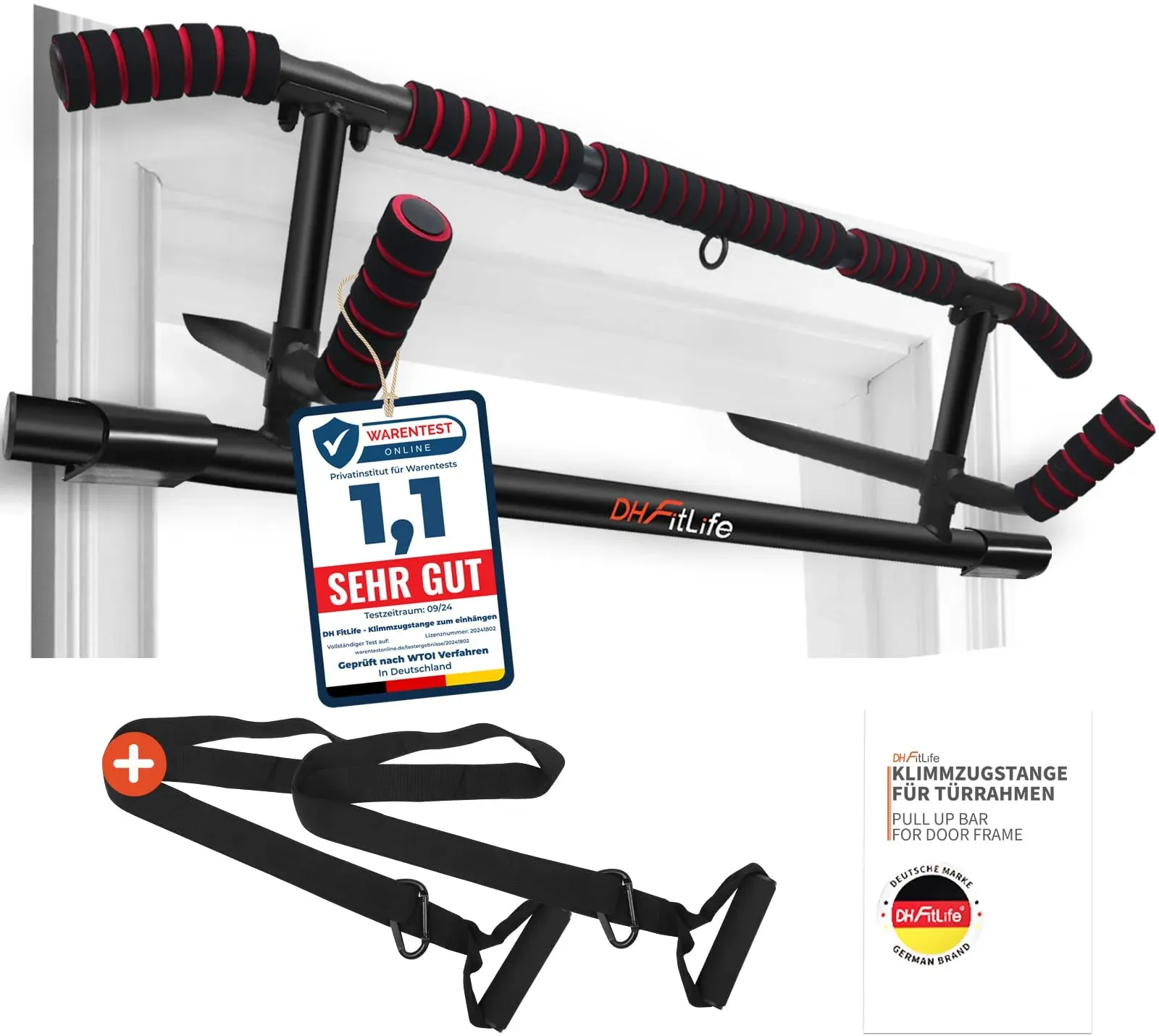 Kategorie: Fitness-Kleingeräte - mamolo - GTIN:0745314984836 - Robuste Konstruktion: Hergestellt aus hochwertigem, langlebigem Stahl, bietet die MAMOLO Klimmzugstange maximale Stabilität und Sicherheit, egal wie intensiv Ihr Training ist Vielseitige Anwendung: Ideal für Klimmzüge, Liegestütze, Sit-ups und viele weitere übungen. Trainieren Sie Rücken, Arme und Schultern effektiv und steigern Sie Ihre Muskelkraft. Einfache Montage: Die MAMOLO Klimmzugstange lässt sich schnell und unkompliziert an jeder Tür montieren ganz ohne Bohren! So können Sie jederzeit und überall trainieren. Ergonomisches Design: Die rutschfesten Griffe sorgen für einen sicheren Halt und maximalen Komfort während Ihres Trainings. Platzsparend: Ideal für kleine Wohnungen nach dem Training einfach abnehmen und verstauen! - 38,69 Euro bei Amazon Marketplace Sports - gefunden von billiger.de ![]() ![]() DH FitLife Klimmzugstange Türrahmen ohne Schrauben | Pull up bar Doorway | Reckstange Turnstange Türreck zum Einhängen | inkl. Schlingentrainer | Für Türrahmen 70-92cm
