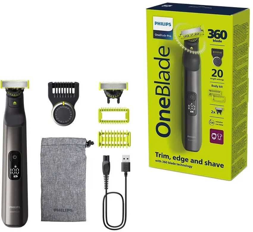15 Händlerangebote bei billiger.de - Kategorie: Elektrische Rasierer - Philips - OneBlade Technologie: Die schnelle Schneideeinheit (12.000, min) ist effizient, selbst bei langem Haar und das Zweifach-Schutzsystem mit Gleitbeschichtung und abgerundeten Spitzen erleichtert das Rasieren und macht es noch angenehmer. Die Verpackung kann variieren. 360-Grad-Klinge: Sie kann sich in alle Richtungen bewegen, sodass sie konstanten Hautkontakt hat und Sie die Kontrolle behalten; Rasieren und trimmen Sie sich ganz einfach, selbst an schwer erreichbaren Stellen, mit weniger Zügen und mehr Komfort Schneidet die Haare und schützt die Haut: Schneiden Sie Ihren Bart auf eine gleichmäßige Länge mit 3 Kammaufsätzen für Dreitagebart (1, 3, 5 mm), stylen Sie präzise Kanten dank der doppelseitigen Klinge und rasieren Sie ganz einfach Haare jeder Länge Pflegen Sie Ihre Körperbehaarung: Trimmen und rasieren Sie Körperbehaarung in jede Richtung mit dem aufsteckbaren Kammaufsatz (3 mm) und dem Hautschutzaufsatz für eine zusätzliche Schutzschicht an empfindlichen Stellen Jederzeit und überall aufladen: Mit dem USB-A-Ladekabel, kann OneBlade zuhause oder unterwegs aufgeladen werden, im Alltag oder auf Reisen (Netzteil nicht im Lieferumfang enthalten) Das Set enthält: 1x Philips OneBlade 360 Face, Body, 3x 360 Klingen, 3x Stoppelkamm (1, 3, 5 mm), 1x Body Kit (1x Click-on Body Comb und 1x Skin Guard), 1x Schutzkappe, 1x USB-A-Ladekabel, ein Benutzerhandbuch - GTIN:8720689040099 Dieses Set bietet einen Rasierer mit Etui und zwei 360-Klingen zu einem sehr guten Preis. ![]() ![]() Philips OneBlade Rasierer QP2734/23 + Etui, Grün/Schwarz, 2x Klinge 360°
