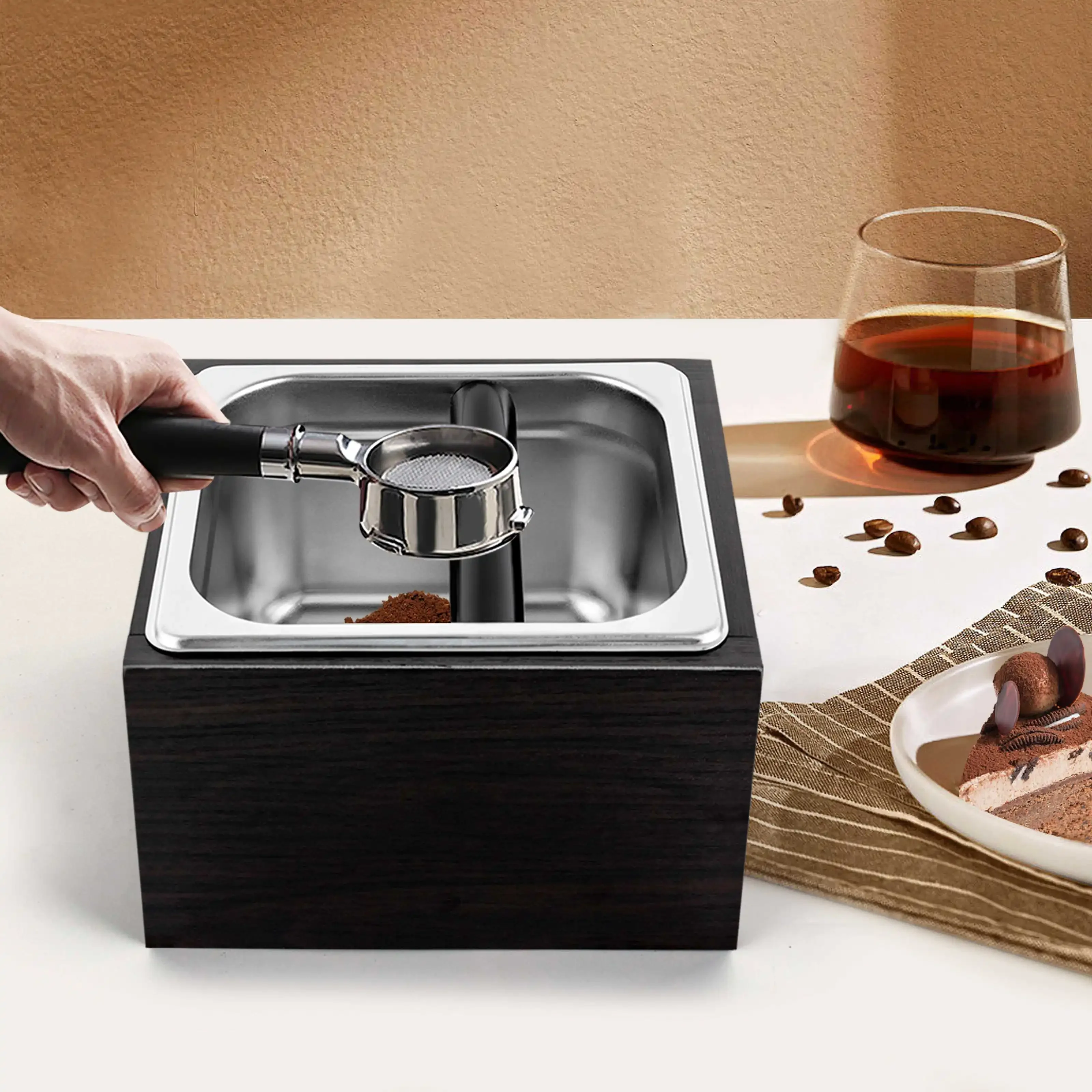 Kategorie: Kaffeezubehör & Espressozubehör - normcore - GTIN:6977166450649 - Nutzen Sie es als eigenständig: Rein und minimalistisch in seiner Silhouette. Die Klopfbox ist ein Zubehör für die Arbeitsplatte, das den Brauprozess bequemer, effizienter und sauberer macht, mit einer praktischen Entsorgungseinheit für Ihre Pucks. Kompakter Komfort – Die großzügige öffnung erleichtert das Herausklopfen von gebrauchtem Boden, ohne zu verschütten und ein Chaos zu verursachen. Wenn es voll ist, ist es genauso einfach, die gestapelten Pucks in Ihren Hauptbehälter zu kippen. Dennoch behält er eine schlanke Stellfläche, um auf die kleinsten Arbeitsplatten zu passen. Leicht zu reinigen – Das Klopfbox-Design verzichtet auf die traditionelle Klopfstange, die schwer sauber zu halten ist. Verwenden Sie stattdessen das zentrale Gummi-Silikon-Pad, um den verwendeten Boden herauszuklopfen. Wenn Sie fertig sind, ist ein schnelles Spülen alles, was Sie brauchen. Langlebig: Hergestellt aus dickem Präzisionsguss aus Aluminiumlegierung, extra robust und langlebig. Vier Anti-Rutsch-Füße halten es stabil. Mit einem schwarzen Finish ist die Normcore Klopfbox eine elegante Ergänzung für alle Arbeitsplatten. Oder zusammen als Set: Das neue Klopfbox-Design passt perfekt zur Normcore Compact Stopfstation und lässt sich darunter als Basis stapeln, um belebte Thekenräume sofort zu entsorgen. Kombiniert hat das innovative Design ein US-Patent gewonnen. - 39,99 Euro bei Amazon Marketplace Kitchen - gefunden ... Diese Klopfbox im Schubladenstil aus Edelstahl und Holz ist eine elegante und langlebige Option für anspruchsvolle Nutzer. ![]() Kaffee-Espresso-Grundrückstände-Klopfbox aus Edelstahl 304 + Holz mit Schubladenstil für Barista-Kaffeebar-Grundbehälter