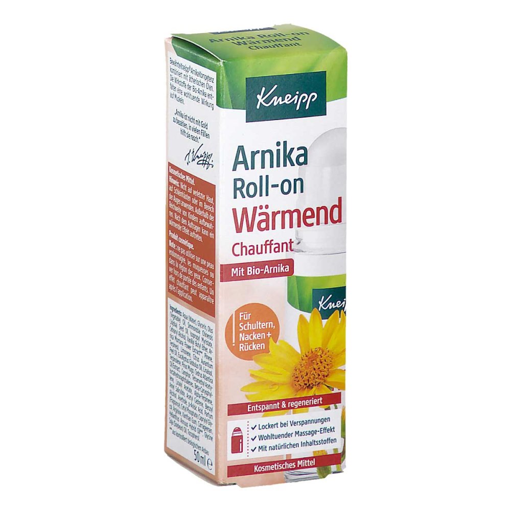 Kneipp - Unser Kneipp Arnika Roll-on Wärmend ist eine schnelle und wohltuende Pflege für unterwegs. Praktisch auch nach körperlichen Aktivitäten. Zieht schnell ein und erzeugt eine wohltuende Wärme. Pflegt die Haut sanft.Wohltuende Wärme kann verspannte Muskeln lösen. Verspannungen können durch überlastungen der Muskulatur auftreten, wie z. B. intensive Sportworkouts, Autofahren, langes Arbeiten im Sitzen oder vor dem PC.Einfach in der Anwendung kein Nachcremen oder Händewaschen notwendig. Anwendung: Dank des Applikators kann die wärmende Textur gezielt auf die strapazierten Muskelpartien von Schulter, Nacken oder Rücken aufgetragen werden. Verspannungen können durch die Massage mit dem Roll-on gelockert werden. Vor Gebrauch gut schütteln. Massage-Tipp: Gönnen Sie sich selbst eine Massage und eine kleine Auszeit. Einfach den Massage-Roller auf den entsprechenden Körperpartien platzieren. Mit leichtem Druck und kreisenden Bewegungen einmassieren. Entspannen Sie sich bei der Entfaltung der Wärmewirkung.Wichtige Hinweise: Kosmetisches Mittel. Nicht auf verletzter Haut, auf Schleimhäuten oder im Bereich der Augen anwenden. Außerhalb der Reichweite von Kindern aufbewahren. Nach dem Auftragen kann ein wärmender Effekt auftreten. Inhaltsstoffe: Aqua (Water), Glycerin, Olus (Vegetable) Oil, Simmondsia Chinensis (Jojoba) Seed Oil, Isopropyl Myristate, Cetearyl Alcohol, Vanillyl Butyl Ether, Arnica Montana Flower Extract**, Pinene, Terpineol, Limonene, Citrus Aurantium Peel Oil, ... ![]() ![]() Kneipp Arnika Roll-On wärmend 50 ml