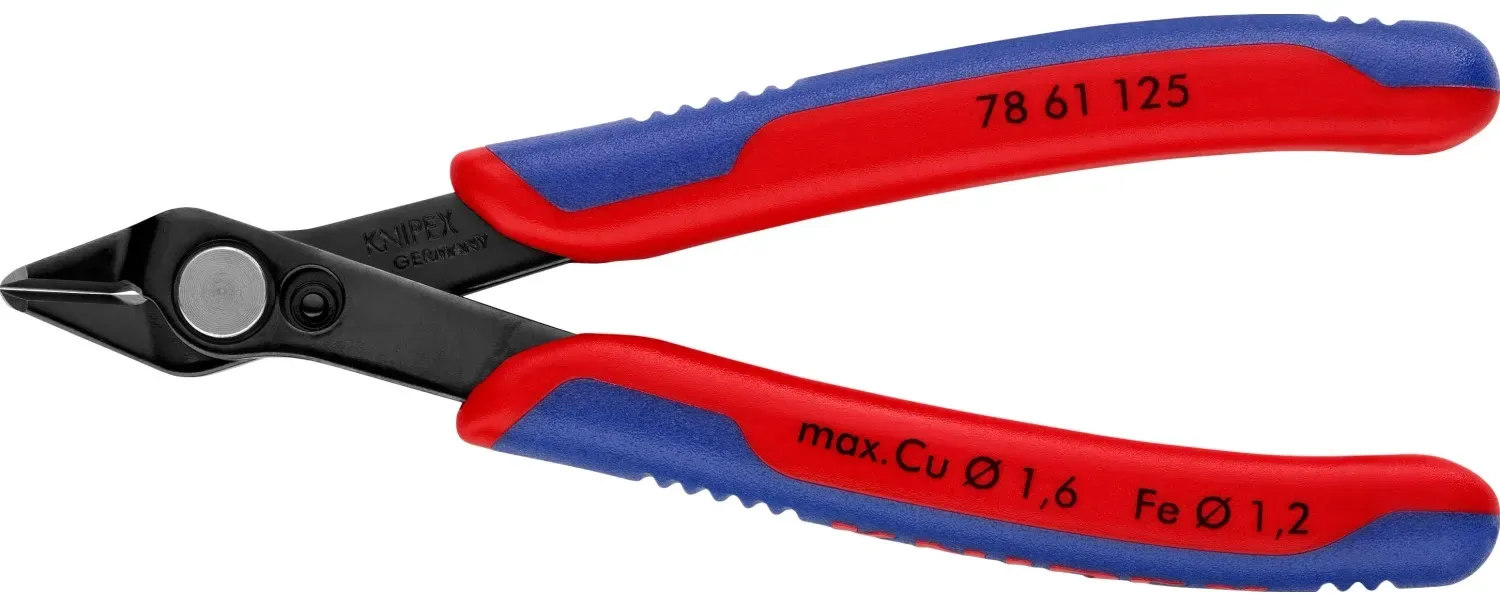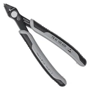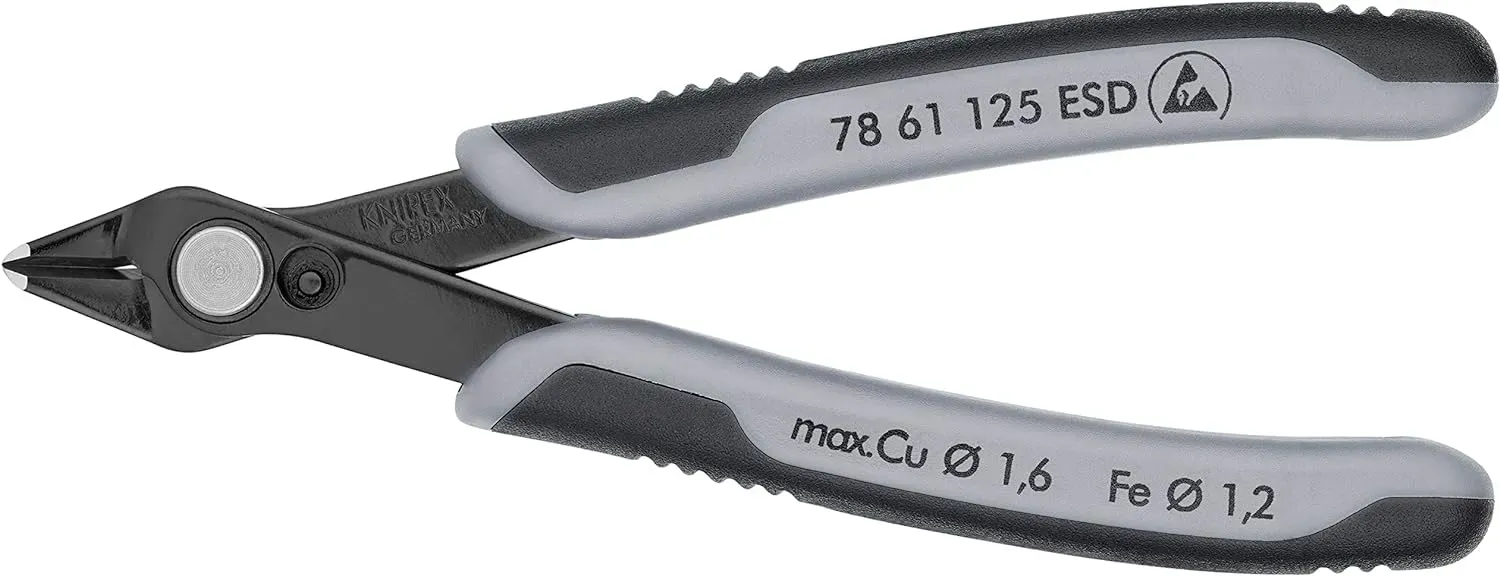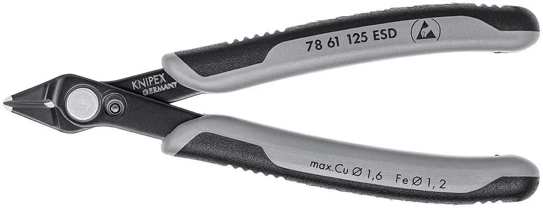 11 Händlerangebote bei billiger.de - Kategorie: Zangen - Knipex - - Präzisionszangen für feinste Schneidarbeiten, z. B. in Elektronik und Feinmechanik - Griffe elektrisch ableitend €“ dissipativ - geschliffene, sehr scharfe Schneiden ohne Facette zum flächengleichen Trennen - exakt geformte Spitzen durchtrennen auch anliegende Drähte ab Ø 0,2 mm - Gelenk mit Edelstahlniet - extrem leichter Gang für ermüdungsarmes Arbeiten - mit öffnungsfeder und öffnungsbegrenzung Modell: - Schneiden zusätzlich induktiv gehärtet, Schneidenhärte ca. 64 HRC - Spezial-Werkzeugstahl, brüniert Electronic Super Knips ESD Knipex 78 61 125 ESD, Diagonale Zange, 9 mm, 1,6 mm, Edelstahl, Stahl, Kunststoff, Schwarz, Grau Knipex 78 61 125 ESD. Typ: Diagonale Zange, Klemmbacke Länge: 9 mm, Maximaler Rohrdurchmesser: 1,6 mm. Länge (mm): 125 mm, Gewicht: 56 g - GTIN:4003773025184 Dieses Angebot bietet die ESD-Version mit Mehrkomponenten-Hüllen zu einem fairen Preis. ![]() ![]() KNIPEX Elektronski Super Knips ESDmit Mehrkomponenten-Hüllen 125 mm, 78 61 125 ESD