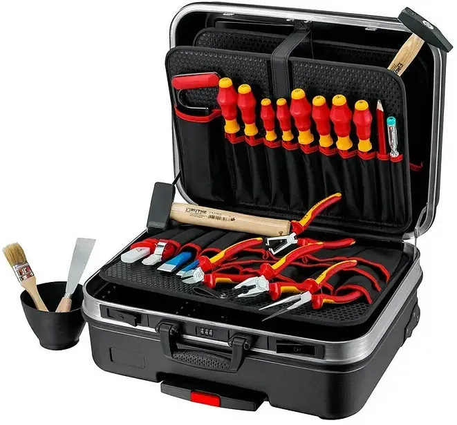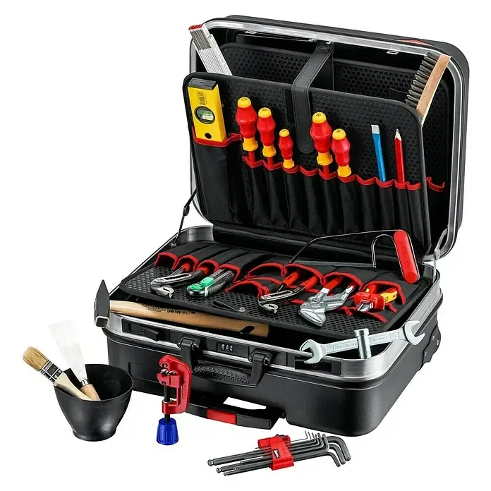 Zangen & Schlaufen Handwerkzeug Satz Sortiment Universal-Sortiment Handwerkzeuge - EAN:4003773084235 - Der Werkzeugkoffer 'BIG Basic Move' Elektro von KNIPEX ist ein strapazierfähiger Koffer mit Trolley-Funktion und Metallscharnieren aus ABS-Material, mit umlaufendem Aluminiumrahmen und vielseitigen Einsteckmöglichkeiten durch elastische Schlaufen und kleinen Taschen. Einmal geöffnet, wird der Deckel von einer Scharniermechanik gehalten. Ein Beschriftungsfeld mit zwei Aufklebern dient zur individuellen Kennzeichnung, ein dreistelliges Zahlenschloss zum sicheren Verschließen des Koffers, und je zwei Metall-Kippschlösser zur Fixierung des Deckels und des Bodens. Die 70mm hohe Bodenschale ist per Druckknopf fixierbar und durch flexible Einsätze unterteilbar. Der Werkzeugkoffer 'BIG Basic Move' Elektro ist mit sechs KNIPEX-Werkzeugen, insgesamt 24 Markenwerkzeugen, teilweise VDE-geprüft nach DIN EN 60900, bestückt. Er enthält KNIPEX Zangen, Seitenschneider, Abmantelungswerkzeug, Kabelmesser (allesamt VDE-geprüft), sechs Wera Schraubendreher für Schlitzschrauben, zwei Schraubendreher Kreuzschlitz PH, zwei Schraubendreher, Kreuzschlitz PZ (allesamt VDE-gerprüft), Wera Spannungsprüfer einpolig, Rennsteig Maurermeißel, Elektrikermeißel, Stabila Zimmermannsbleistift, Picard Gipsbecher, Flachpinsel, Schlosserhammer, Fäustel, maurerfreund Malerspachtel und eine Haunstätter PUK-Säge. - gefunden von Kelkoo Ein umfassend bestückter Werkzeugkoffer für Sanitärarbeiten, der eine spezialisierte Auswahl an Werkzeugen enthält. ![]() Knipex Werkzeugkoffer 'BIG Basic Move' Sanitär, 31-teilig, Werkzeug-Set