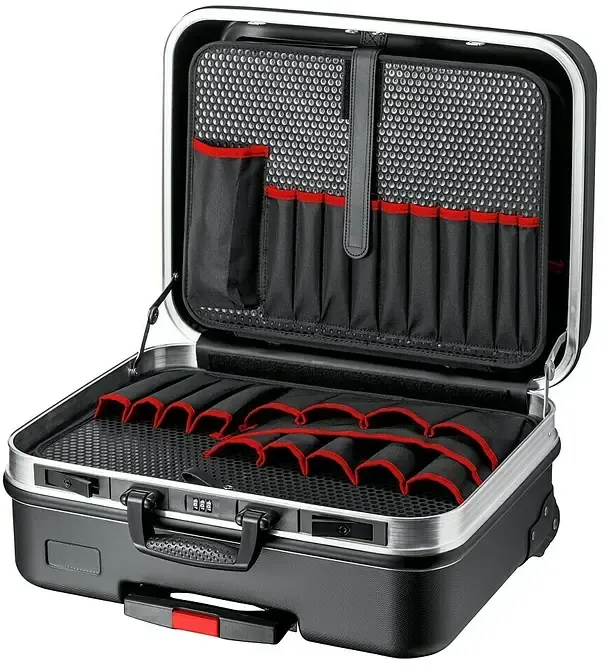 Kategorie: Werkzeugkoffer - Knipex - GTIN:4003773056904 - Beschreibung: Zwei Metall-Kippschlösser und ein dreistelliges Zahlencodeschloss zum sicheren Verschließen des Deckels Beschriftungsfeld mit zwei Aufklebern zur individuellen Kennzeichnung Max. Zuladung: 15 kg 27 Liter Fassungsvermögen Stabiler, ergonomischer Tragegriff Strapazierfähige Ausführung aus ABS-Material, schwarz Umlaufender Aluminiumrahmen Metallscharniere Dokumentenfach im Deckel Zwei herausnehmbare Werkzeugtafeln aus schmutzabweisenden PP-Hohlkammerplatten mit 21 bestückbaren Werkzeugtaschen Bodenschale, per Druckknopf fixierbar, Höhe 50 mm, durch Einsätze weiter unterteilbar und Abdecktafel mit zwölf großen Werkzeugtaschen und einem Flachfach Insgesamt 41 Steckmöglichkeiten - 113,70 Euro bei kirchner24.de - gefunden von billiger.de Eine klassische Werkzeugtasche, die sich durch ihre Robustheit und Handlichkeit auszeichnet. ![]() Knipex Werkzeugtasche Classic 00 21 02 LE