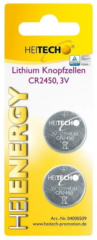 Kategorie: Batterien & Akkus - Heitech - GTIN:4250040905094 - HEITECH Lithium Knopfzellen, 2-er Pack, CR2450, 3 V Knopfzelle - 2,29 Euro bei OTTO - gefunden von billiger.de Dieses Duracell 2er-Pack für 2.99 Euro bietet eine gute Balance aus Markenqualität und Preis. ![]() ![]() Duracell CR2450 Knopfzellen (2 Stück), CR 2450 Lithium-Knopfzellen 3 V