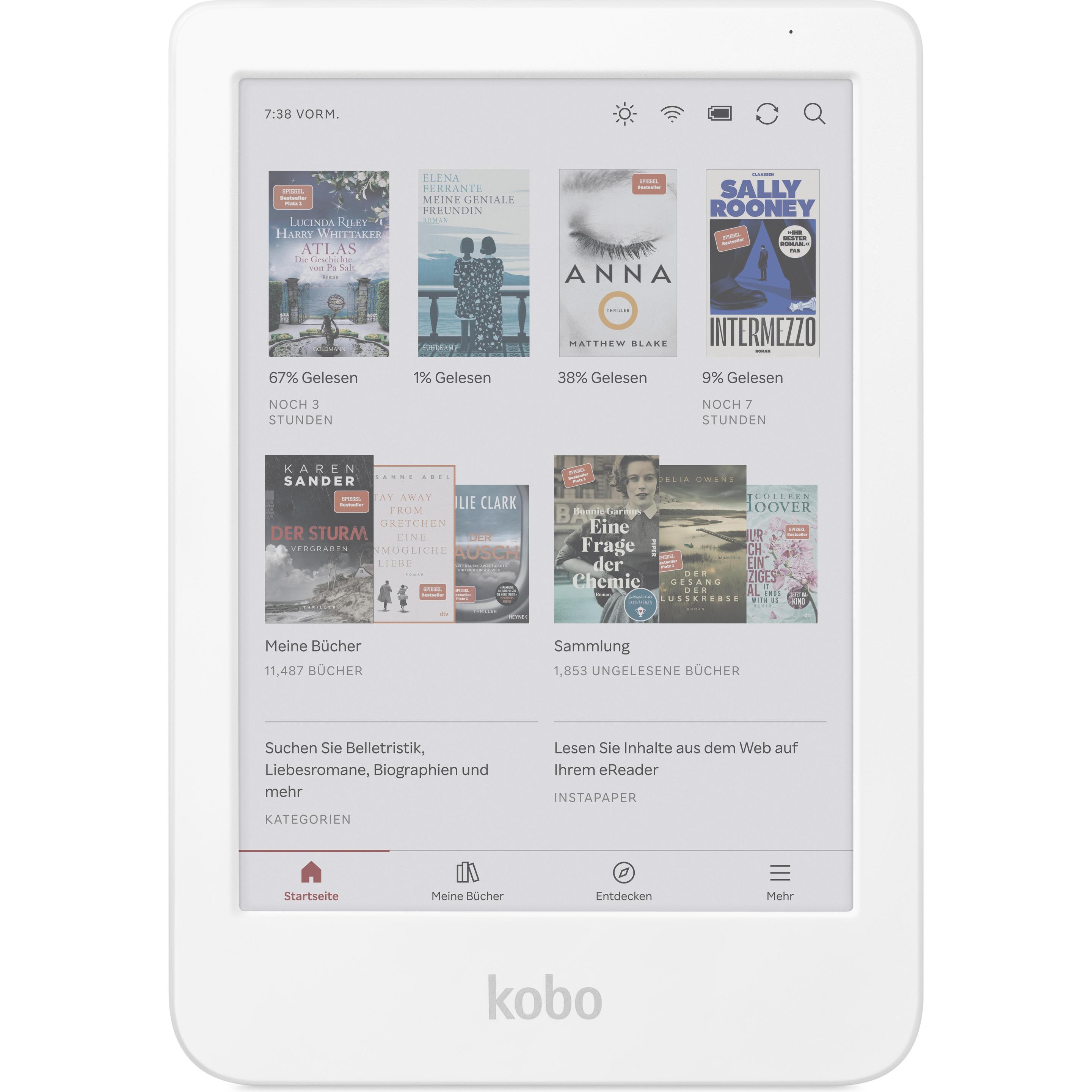 Kobo - EAN: 0681495009558 - eBook-Reader Kobo Clara BW:Kobo Clara BW klassischer Schwarz-Weiß-E-Book-ReaderMit dem Kobo Clara BW Reader wird das Lesen von E-Books zum absoluten Vergnügen. Dieses Lesegerät ist mit einem E-Ink Carta 1300 HD-Bildschirm ohne Blendung ausgestattet und Sie werden sicherlich zu schätzen wissen, dass es vollständig wasserdicht ist. Es verfügt über 16 GB integrierten Speicher, sodass Sie Ihre Lieblingsbücher überall hin mitnehmen können. Besonders beim abendlichen Lesen können Sie den ComfortLight PRO Dunkelmodus mit Helligkeitsanpassung und Blaulichtunterdrückung nutzen. Kobo Clara BW wird aus recyceltem Kunststoff hergestellt und trägt so zur Nachhaltigkeit unserer Umwelt bei. Akkulaufzeit bis zu 53 Tage Umfangreiche Sammlung von E-Books und Hörbüchern im Kobo Store Lesen gespeicherter Artikel mit der Pocket-Anwendung Besonders nachts werden Sie den Bildschirm des Kobo Clara BW Readers zu schätzen wissenMit dem 6' Clara BW E Ink Carta 1300 HD-Bildschirm ist das Lesen auch bei hellem Sonnenlicht völlig blendfrei und komfortabel.... - bei alza.de - aus Yadore Produktdaten ![]() ![]() NEUWERTIG Kobo - Clara 2e eBay 6 Zoll Touchscreen Comfortlight 16GB WLAN Bluetooth N506