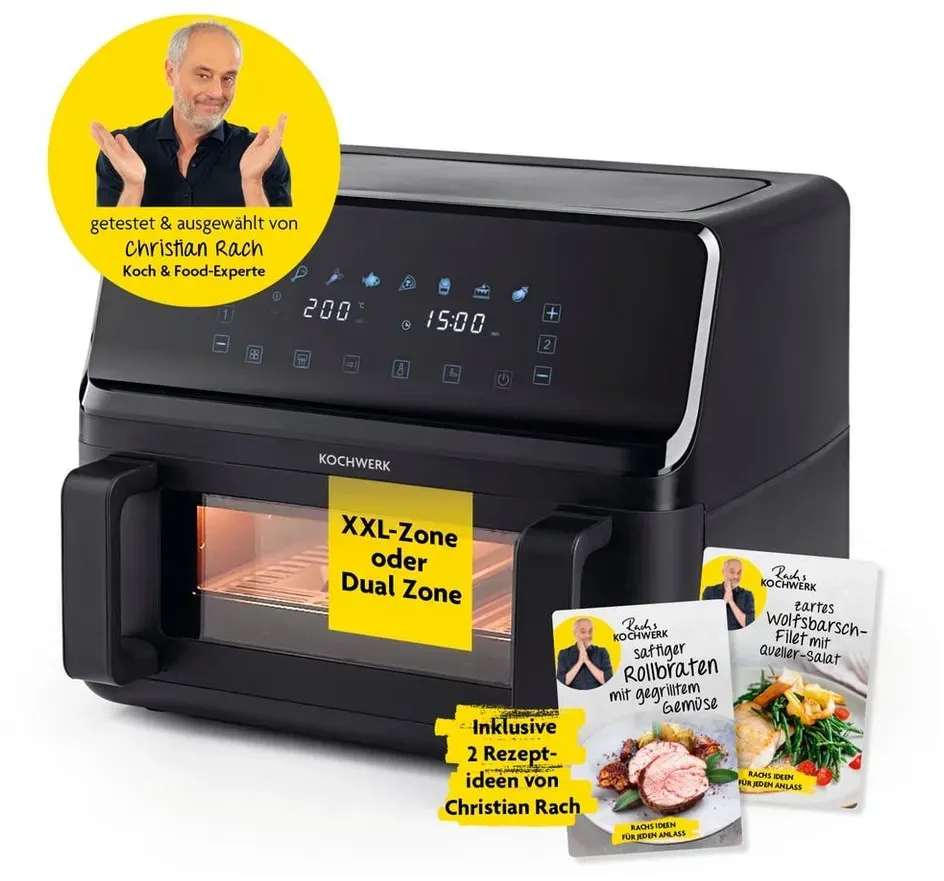 Kategorie: Fritteusen - GTIN:4067522036548 - XXXLHEIßLUFTFRITTEUSE Rachs Kochwerk, in der Farbe Schwarz, aus dem Material Metall, Kunststoff Der Artikel hat ein Fassungsvermögen von 7 L. Der Artikel hat eine Größe von 36x31x39 cm., die Besonderheiten des Artikels sind antihaftbeschichteter Innenbehälter, Temperaturanzeige, Betriebsanzeige, Timer, Heißlufttechnologie, Display, Touchscreen. - 99,99 Euro bei XXXLutz.de - gefunden von billiger.de ![]() kaufland.d e DS Produkte KOCHWERK Doppelkammer Heißluftfritteuse 7L Digitaler Edelstahl Airfryer mit Touchscreen 10 Programmen Frittieren ohne öl fettarm Smart-Cook Funktion 12549