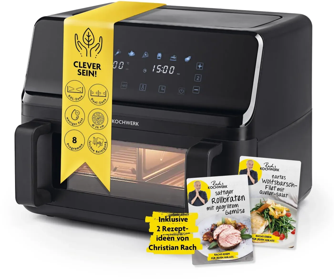 3 Händlerangebote bei billiger.de - Kategorie: Fritteusen - KOCHWERK - DUAL-ZONE FUNKTION - Ermöglicht die zeitglIndividuelles Programm pro Kammer wählen = Fertigstellungszeit beider Speisen wird automatisch synchronisierteiche Zubereitung unterschiedlicher Speisen SYNC-FUNKTION - Individuelles Programm pro Kammer wählen = Fertigstellungszeit beider Speisen wird automatisch synchronisiert TRENNBARE KAMMER - Digitale Fritteuse mit teilbarer 9-Liter-Kammer zum Garen, Braten und Frittieren PROGRAMME - 8 One-Touch-Programme & manueller Modus: Steak, Hähnchenschenkel, Shrimps, Fisch, Pizza, Pommes frites, Backen, Gemüse LEICHTE REINIGUNG - Die Trennwand und Einsatzroste sind spülmaschinengeeignet - GTIN:4067522062240 ![]() ![]() Rachs KOCHWERK Vario-Doppelkammer Heißluftfritteuse 9 L | Airfryer mit teilbarer Kammer, Touchscreen & 8 Programmen | Frittieren von Speisen ohne öl - fettarm | 2700 W Smart-Cook Funktion