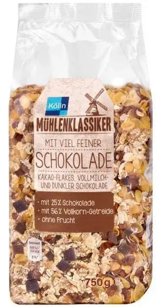9,05 EUR / kg. - Getreide, Reis & Müsli Lebensmittel Frühstück & Snacks Lebensmittel & Einkäufe - EAN:4000540004687 - Müsli mit 25% Schokolade und Vollmilchschokolade sowie 10% Kakao-Cornflakes. mit Vollmilch- und dunkler Schokolade mit Kakao- und Cornflakes mit 56% Vollkorn-Getreide ohne Frucht - gefunden von Kelkoo ![]() Kölln Müsli Klassich mit Schokolade 750 g