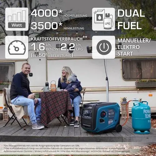 Zustand: Neu - Generatoren - K&S Könner&Söhnen - KS 4000iEG S - EAN: 4260405364756 - Eingebaute Steuerungseinheit sorgt dafür, dass Abläufe des Generators mit stabiler Frequenz von 50 Hz und Spannung 230 V gesteuert und kontrolliert werden. Dadurch wird der zuverlässige Betrieb empfindlicher und hochpräziser Elektronik gewährleistet. Gas stromerzeuger kann sowohl mit Benzin als auch mit Flüssiggas (Propan, Butan) betrieben werden. Der Lieferumfang enthält alles, was zur Verwendung : einen Schlauch mit Druckminderer zum Anschluss an eine Gasflasche Kompakte Größe und schallgedämmtes Gehäuse mit Stützfüßen und minimalem Geräuschpegel (66 dB Lpa 7 m) sorgen für eine bequeme Nutzung und einen einfachen Transport Camping Strom Generator Notstromaggregat inverter ist mit der Kraftstoffsparfunktion (ECONOMY MODE) ausgestattet, die den Einsatz des Generators bei niedrigen Motordrehzahlen ermöglicht und den Kraftstoffverbrauch um bis zu 50% senkt Der zuverlässige K&S Firmenmotor zeichnet sich durch eine erhöhte Verschleißfestigkeit, einen dauerhaften und stabilen Betrieb sowie erfüllt alle europäischen Qualitätsstandards, einschließlich der EURO V Abgasnorm Das notstromaggregat benzin leise ist mit einer LED-Anzeige, einer Steckdose 16 A, zwei USB-Anschlüssen 5 V/1 A, 5 V/2,1 A, einem Energiesparmodus-Schalter (ECON) Der hochwertige Synchronalternator mit 100% Kupferwicklung kann höchsten Spannungsüberlastungen ohne Beschädigungen standhalten und damit einen dauerhaften und ... ![]() ![]() Könner & Söhnen LPG/Benzin-Inverter-Generator KS 4000iEG S